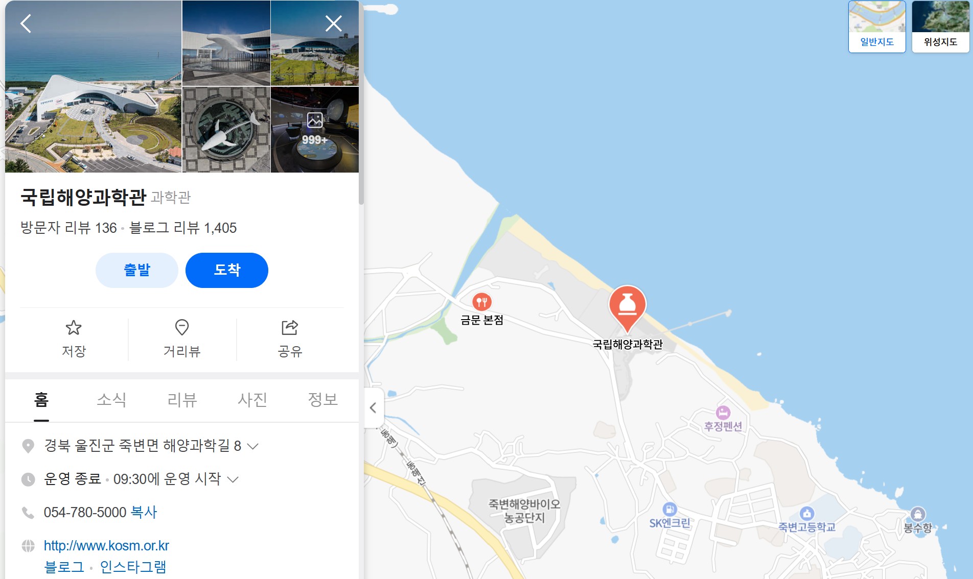 - 내비게이션에 '국립해양과학관' 또는 '경상북도 울진군 죽변면 해양과학길 8'을 검색하세요.