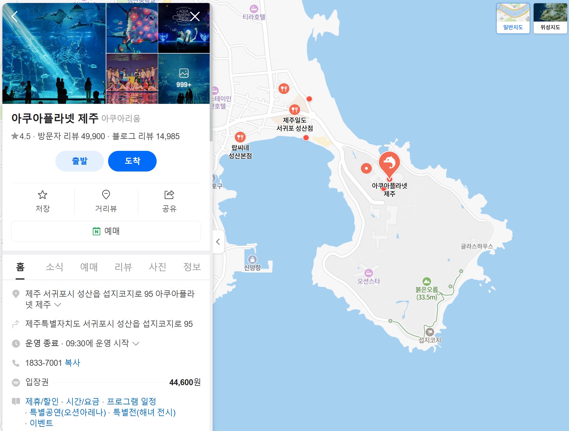 - 내비게이션에 '아쿠아플라넷 제주' 또는 '제주 서귀포시 성산읍 섭지코지로 95'를 검색하여 방문하세요.