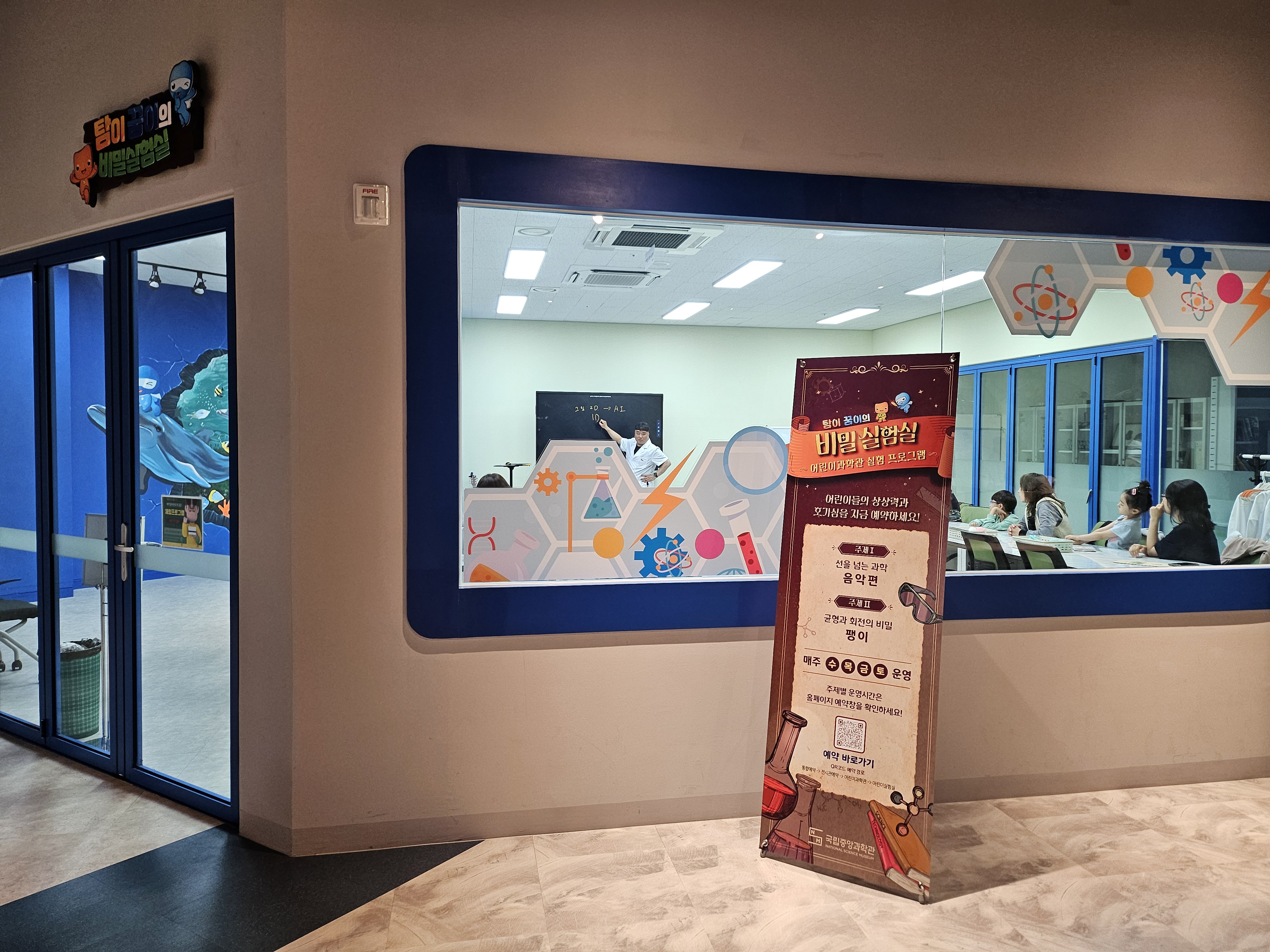 과학 선생님의 진행 아래 실험 체험 수업이 진행되는 별도 강의실. 사전 예약 필수이며, 단체 참여도 가능한 유익한 코너입니다.