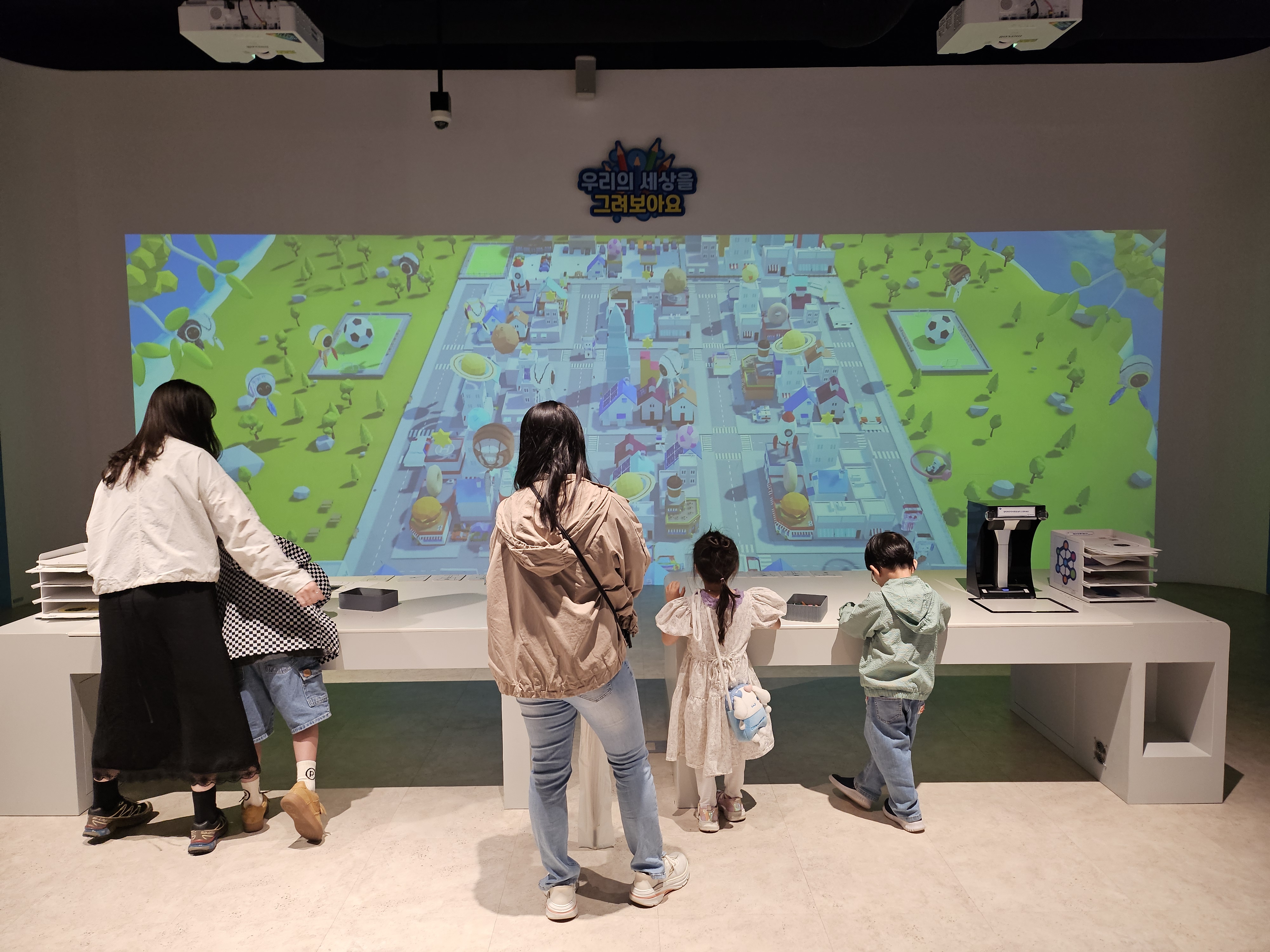 조이스틱을 이용해 화재현장에서 조난자를 구조하는 미션! 로봇을 조작해 목표물을 옮기며 기계 조작 능력과 집중력 향상에 좋은 체험이었습니다. 아이들이 색칠한 그림을 스캔하면 화면 속에 본인만의 드론이나 로봇 캐릭터가 나타나 움직이는 체험. 두 딸아이 모두 여기에서 가장 큰 만족도를 보였습니다. 색연필을 들고 색칠하느라 한참을 머물렀습니다.