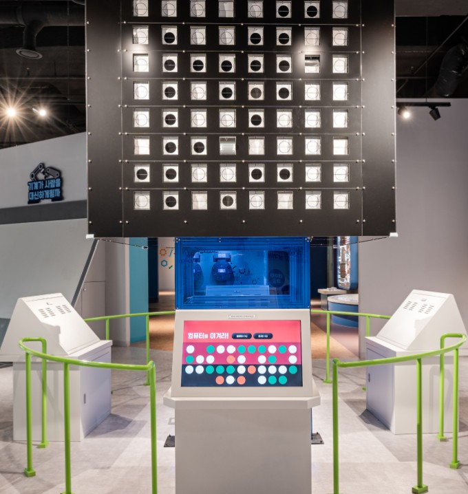 기계와 로봇의 역사, 구조를 보여주는 전시와 직접 로봇 부품을 움직여보는 기초 조작 체험 코너입니다. 로봇 팔을 움직이며 기계 작동 원리를 체감할 수 있었습니다. 컴퓨터와 색깔 뒤집기 바둑 게임을 할 수 있는 공간. 간단하지만 승부욕을 자극하며 논리적 사고 훈련에도 도움이 됩니다. 두 딸아이 모두 컴퓨터에게 져서 아쉬워했지만, “다음엔 꼭 이길 거야!” 하는 도전 정신을 끌어내는 공간이었습니다.
