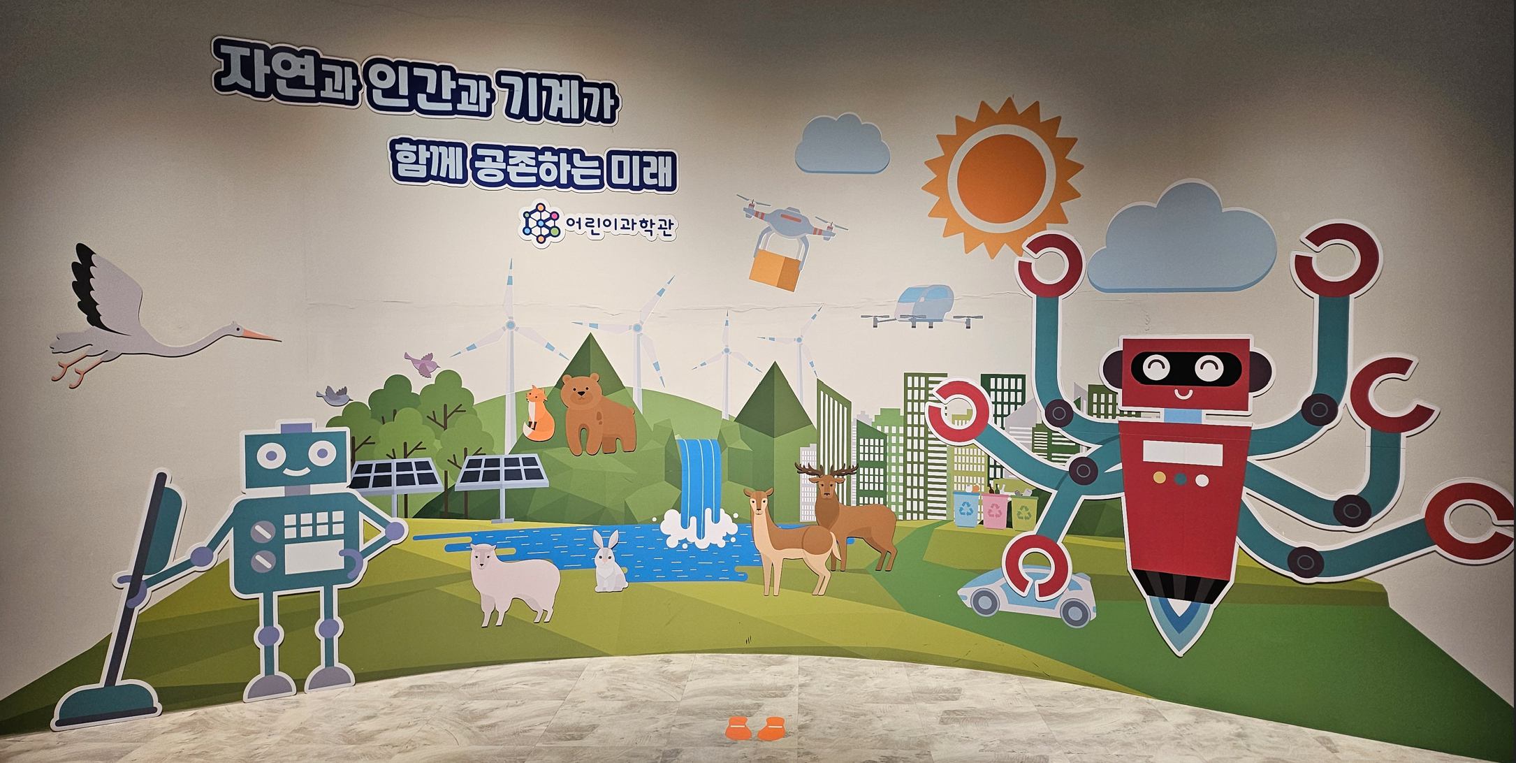 입구에 들어서자마자 보이는 대형 전시물은 아이들과 로봇이 지구 위에서 함께 정글짐처럼 놀고 있는 모습으로,