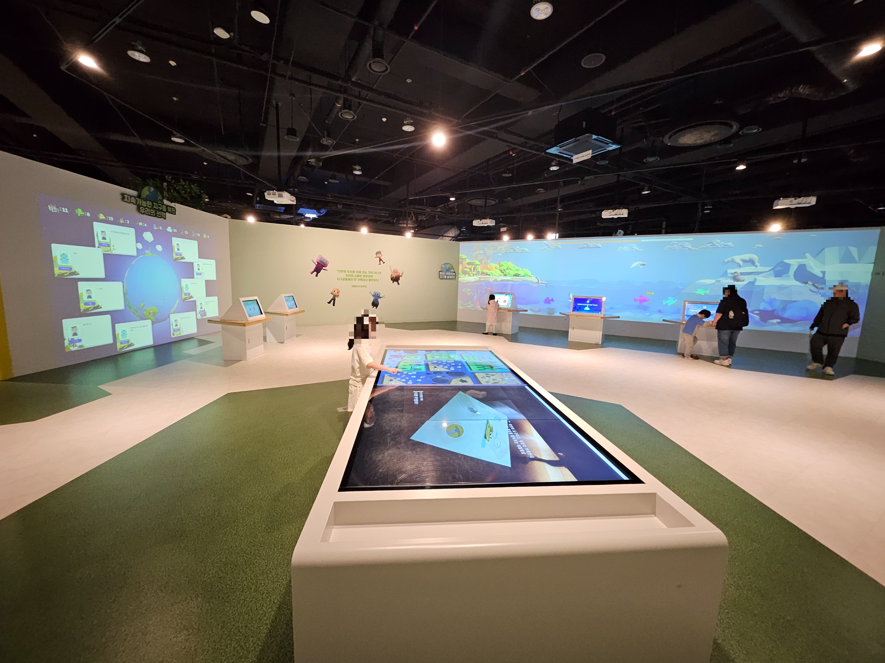 주사위를 던져서 칸을 이동하며 생물 정보를 배우는 보드게임 형식의 전시물로 게임에 몰입하면서 자연 보호의 중요성을 학습할 수 있는 코너입니다. 터치스크린으로 가상 도시를 구성하거나, 빔 프로젝트 앞에서 북극곰을 구하는 미션을 수행하면 스크린 위 게이지가 점점 차오르며 지구가 회복되는 모습을 보여줍니다. 두 딸아이 모두 미션 성공을 위해 열심히 움직이며 “내가 지구를 구했어!” 하고 뿌듯해하는 모습이 인상 깊었습니다.