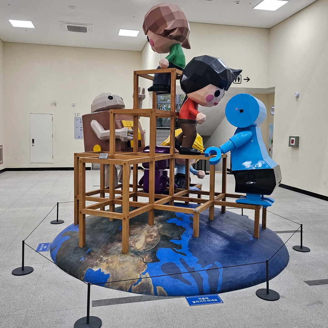 입구에 들어서자마자 보이는 대형 전시물은 아이들과 로봇이 지구 위에서 함께 정글짐처럼 놀고 있는 모습으로,