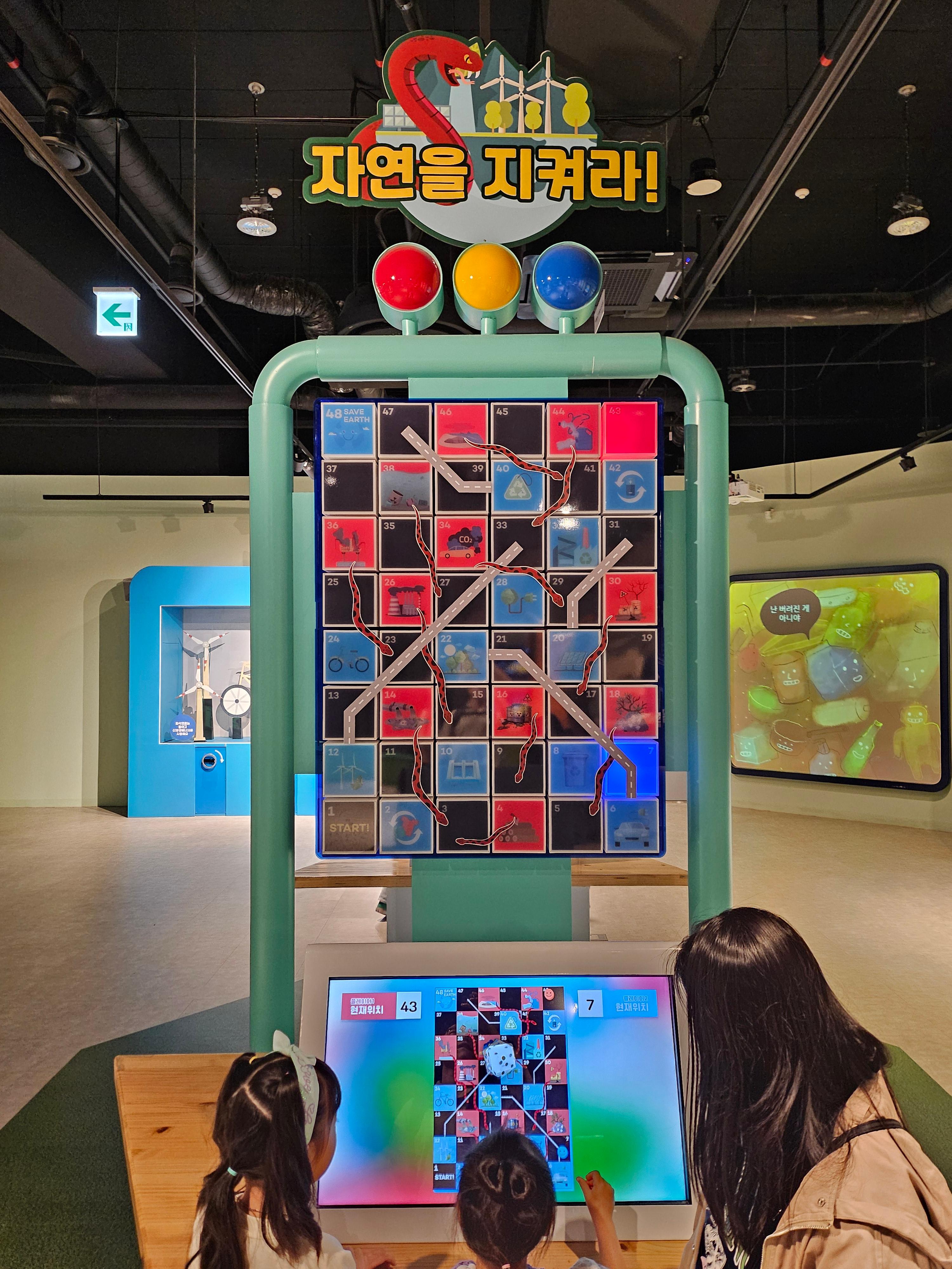 주사위를 던져서 칸을 이동하며 생물 정보를 배우는 보드게임 형식의 전시물로 게임에 몰입하면서 자연 보호의 중요성을 학습할 수 있는 코너입니다. 터치스크린으로 가상 도시를 구성하거나, 빔 프로젝트 앞에서 북극곰을 구하는 미션을 수행하면 스크린 위 게이지가 점점 차오르며 지구가 회복되는 모습을 보여줍니다. 두 딸아이 모두 미션 성공을 위해 열심히 움직이며 “내가 지구를 구했어!” 하고 뿌듯해하는 모습이 인상 깊었습니다.