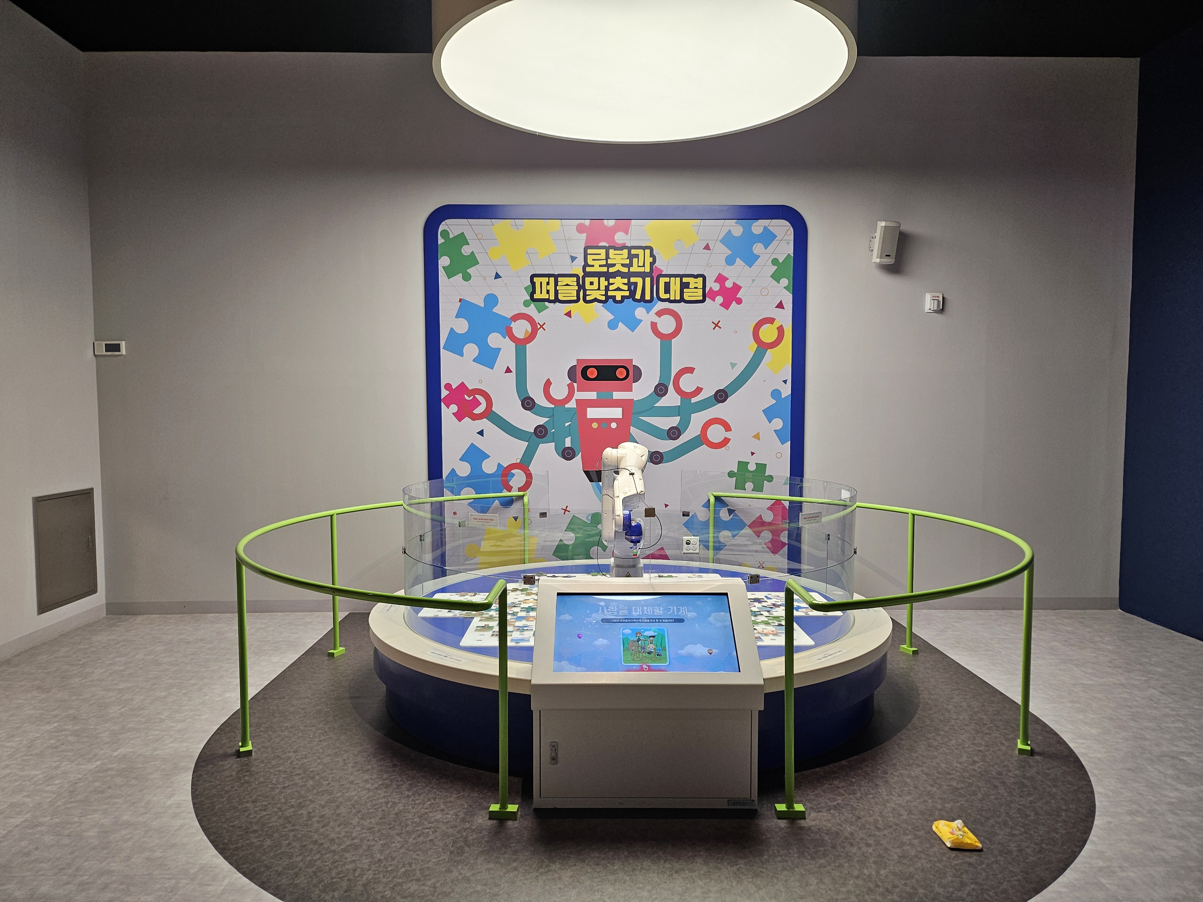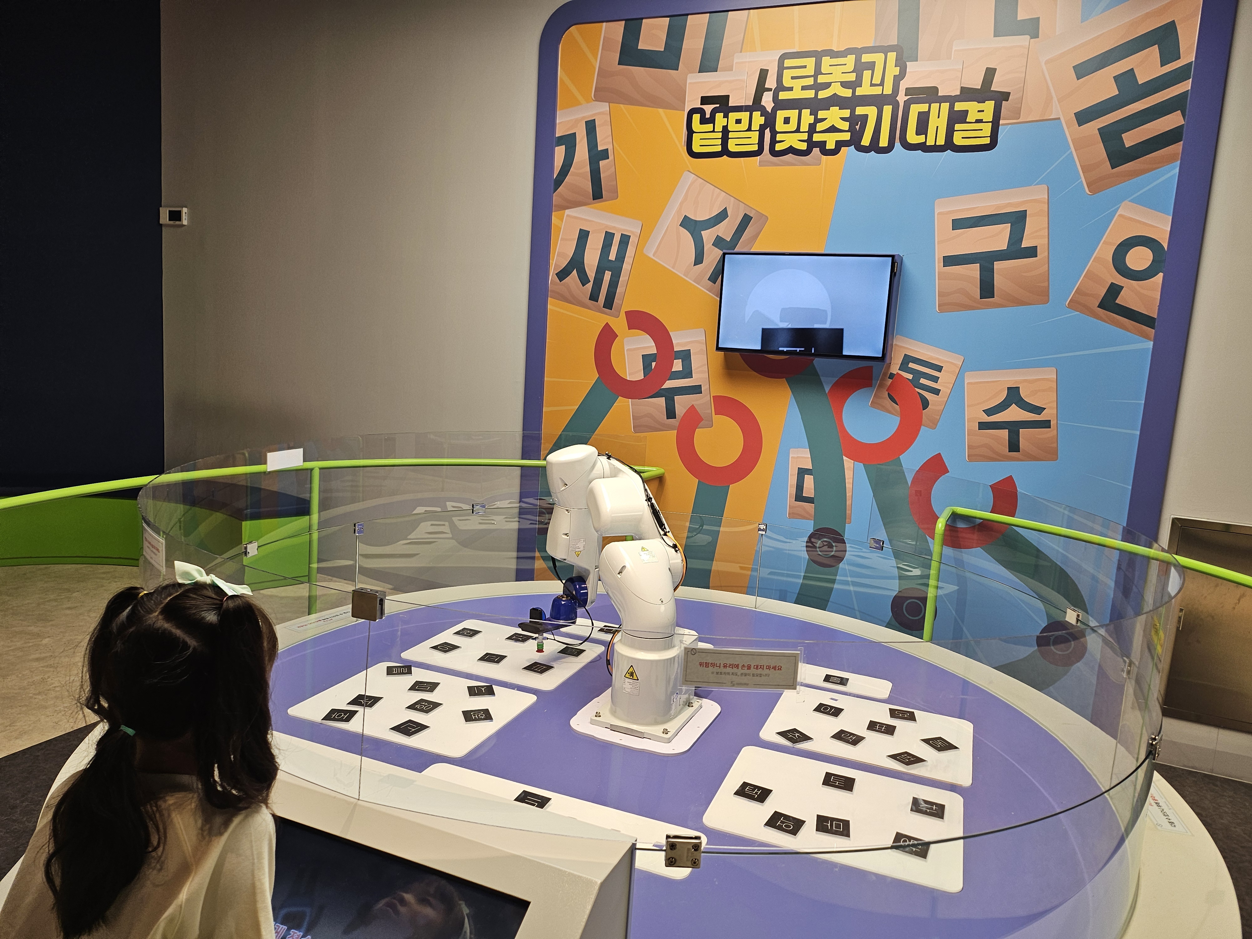 로봇팔과 인간이 퍼즐과 낱말을 맞추며 경쟁하는 체험존. 아이들이 로봇과 협업하면서도 미래 기계와의 관계성을 자연스럽게 배울 수 있습니다. 다만 속도가 느린 점은 아쉬운 부분이었어요.
