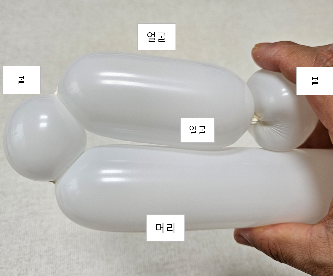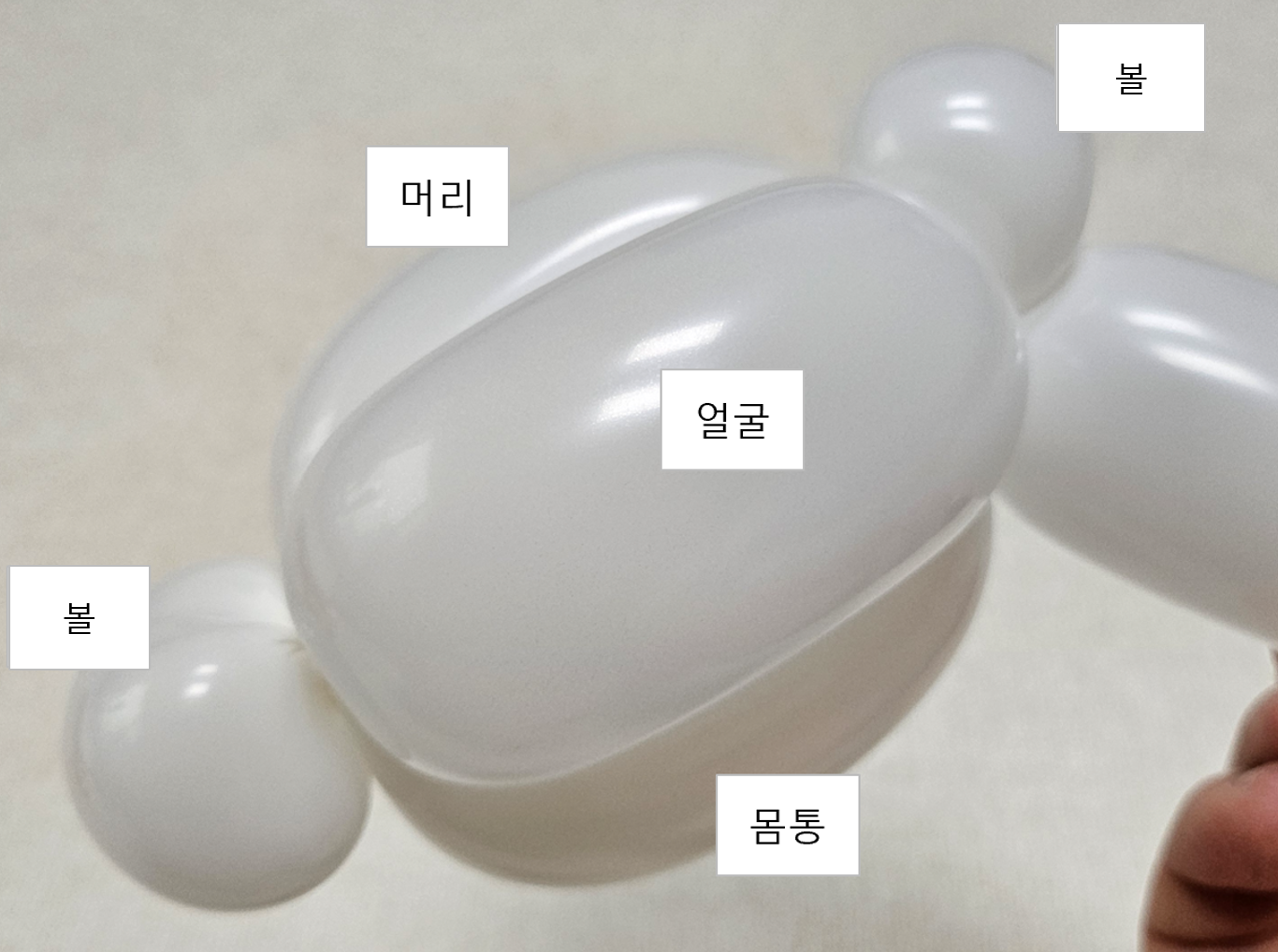 (영상에서는 2개의 막대풍선을 준비하여 몸통 부분에 1개, 귀 부분에 1개를 사용하셨습니다.)