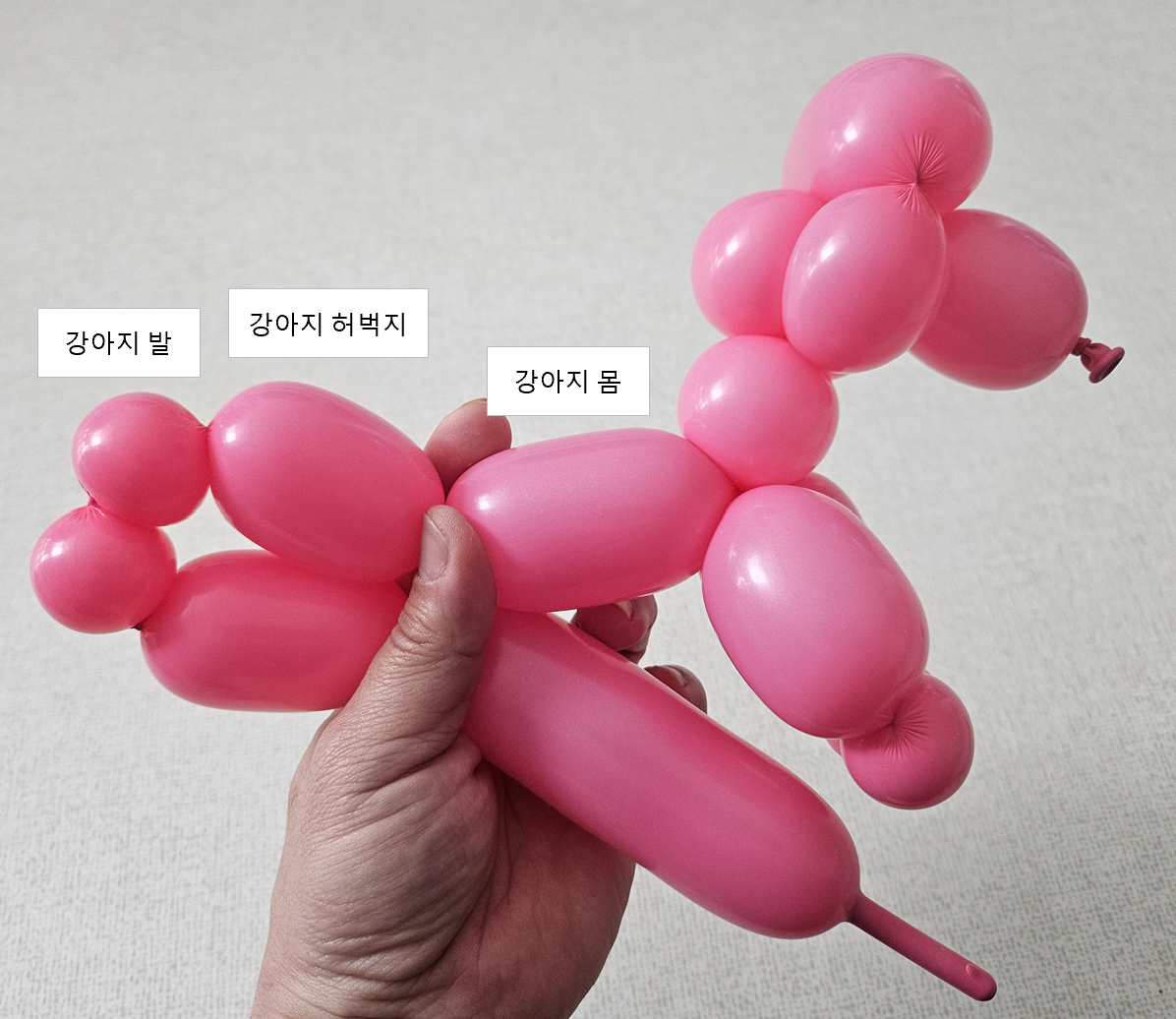 - 엉덩이 부분에 남은 공기를 막대풍선 끝부분으로 보내 귀여운 꼬리를 만들어 줍니다.
