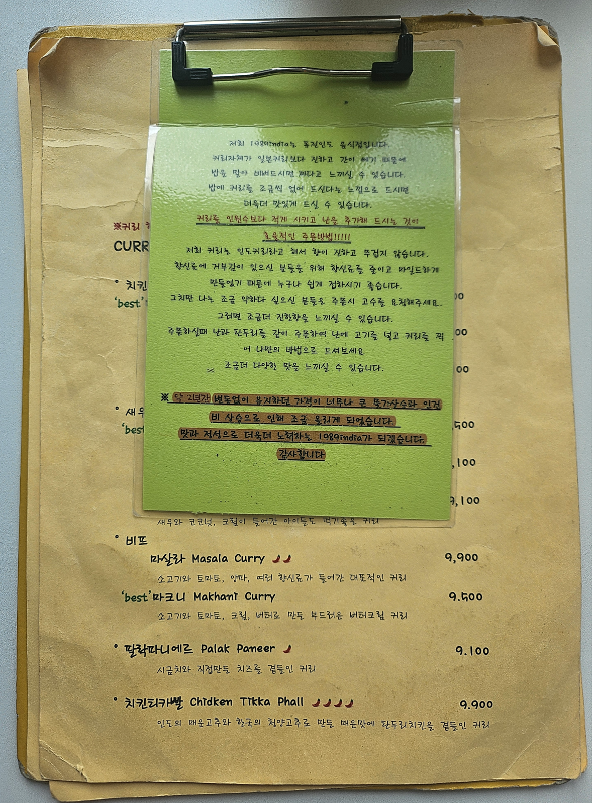 녹색 코팅지에 음식점 소개와 효율적인 주문 방법을 안내해두었습니다.