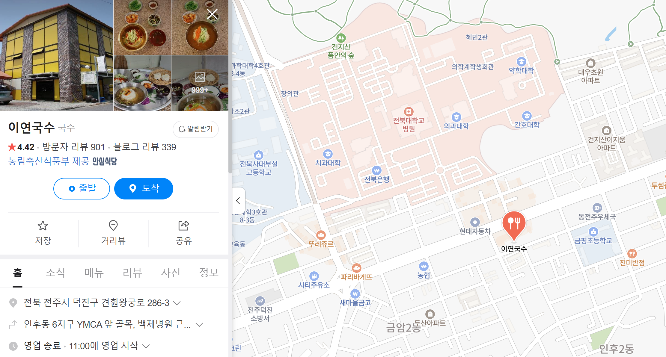 "이연국수"는 전북대학교 병원 정문 입구 근처에 자리 잡고 있습니다.