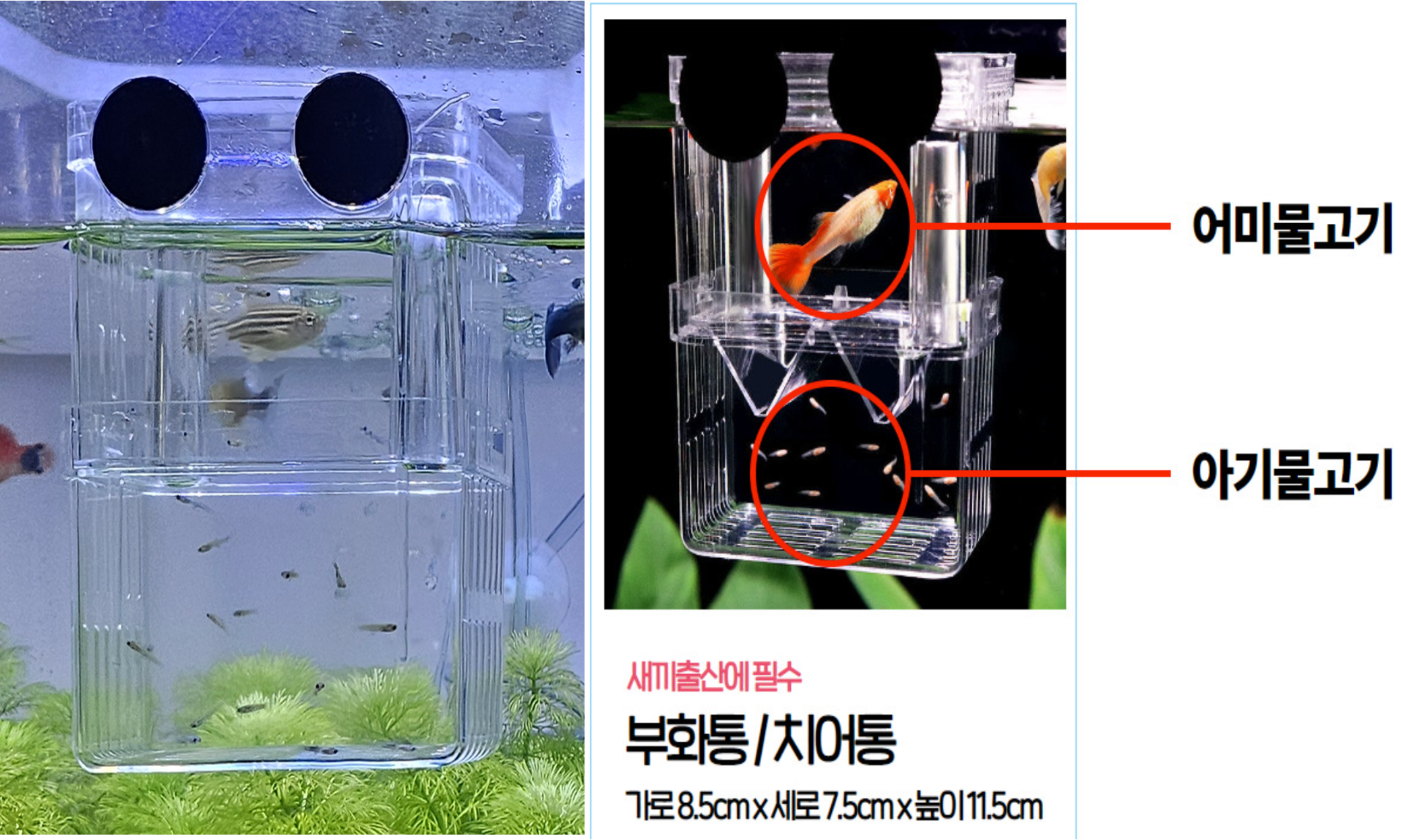 - 투명 플라스틱 재질로 되어 있어 어미/아기 물고기를 잘 관찰할 수 있음