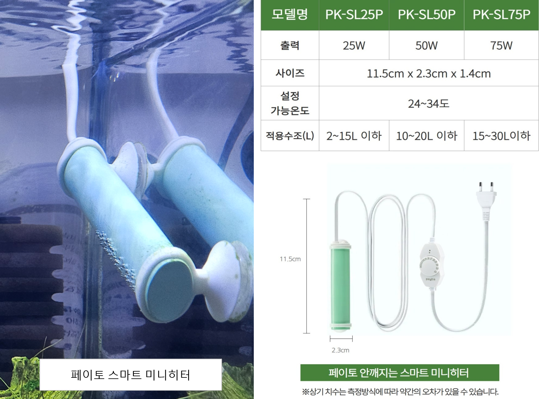 - 어항 안에 두고 사용하기 적합하고, 용량을 큰 것으로 선택하여 온도 조절의 여유를 고려하였습니다.