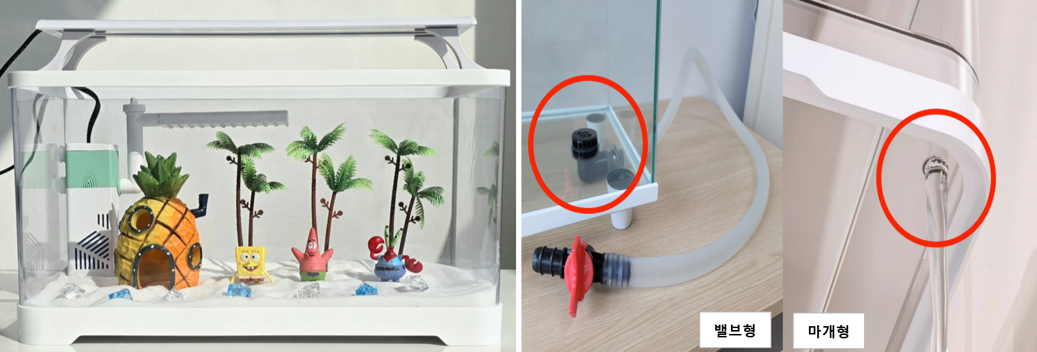 - 해당 어항은 거북이를 키우기 좋은 용도로 저와 같이 물고기를 키우게 되면 어항 내 물이 많기 때문에 환수 마개 또는 밸브를 사용하기가 어려웠습니다. 환수를 위해 어항을 이동시키려면 물 무게 때문에 흔들림이 발생해서 위험성이 있습니다.