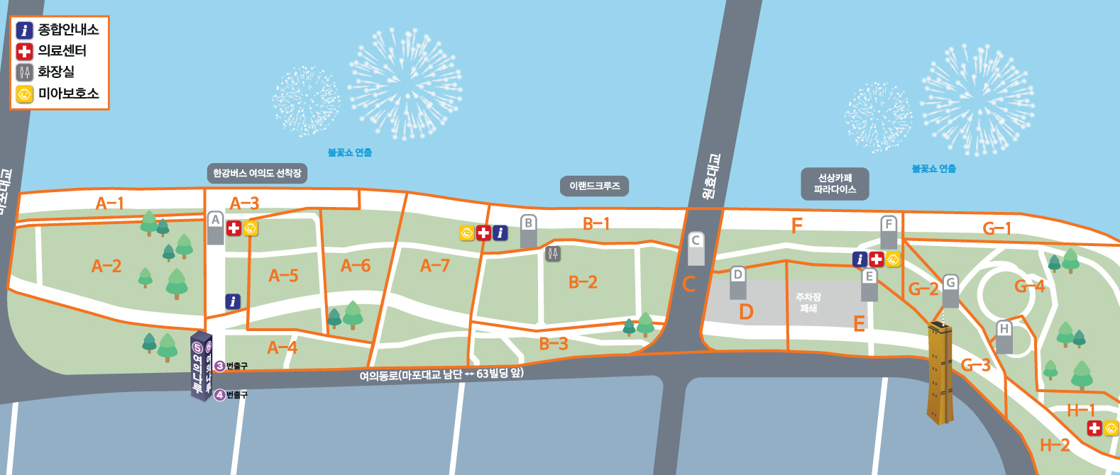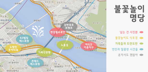 여의도 현장만큼 불꽃을 생생하게 볼 수 있는 곳은 없겠지만, 북적이는 인파를 피하고 조금 더 여유롭게 불꽃을 즐기고 싶다면 숨겨진 명당들을 공략해 보세요!