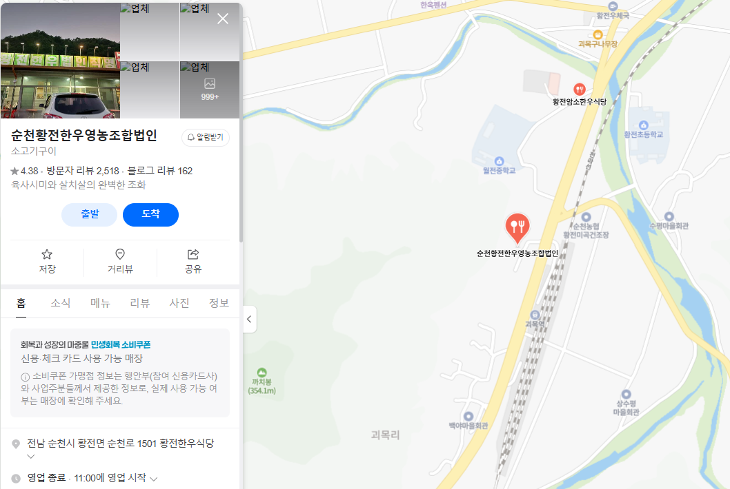 처갓집 근처에는 '순천황전한우영농조합법인' 정육 식당이 있는데 신선한 소고기를 저렴하게 판매를 하고 있습니다. 여름휴가 때나 명절에 방문했을 때는 매번 고기를 사 와서 어른들과 아이들을 위해 정성스레 고기를 구워서 배불리 먹습니다.