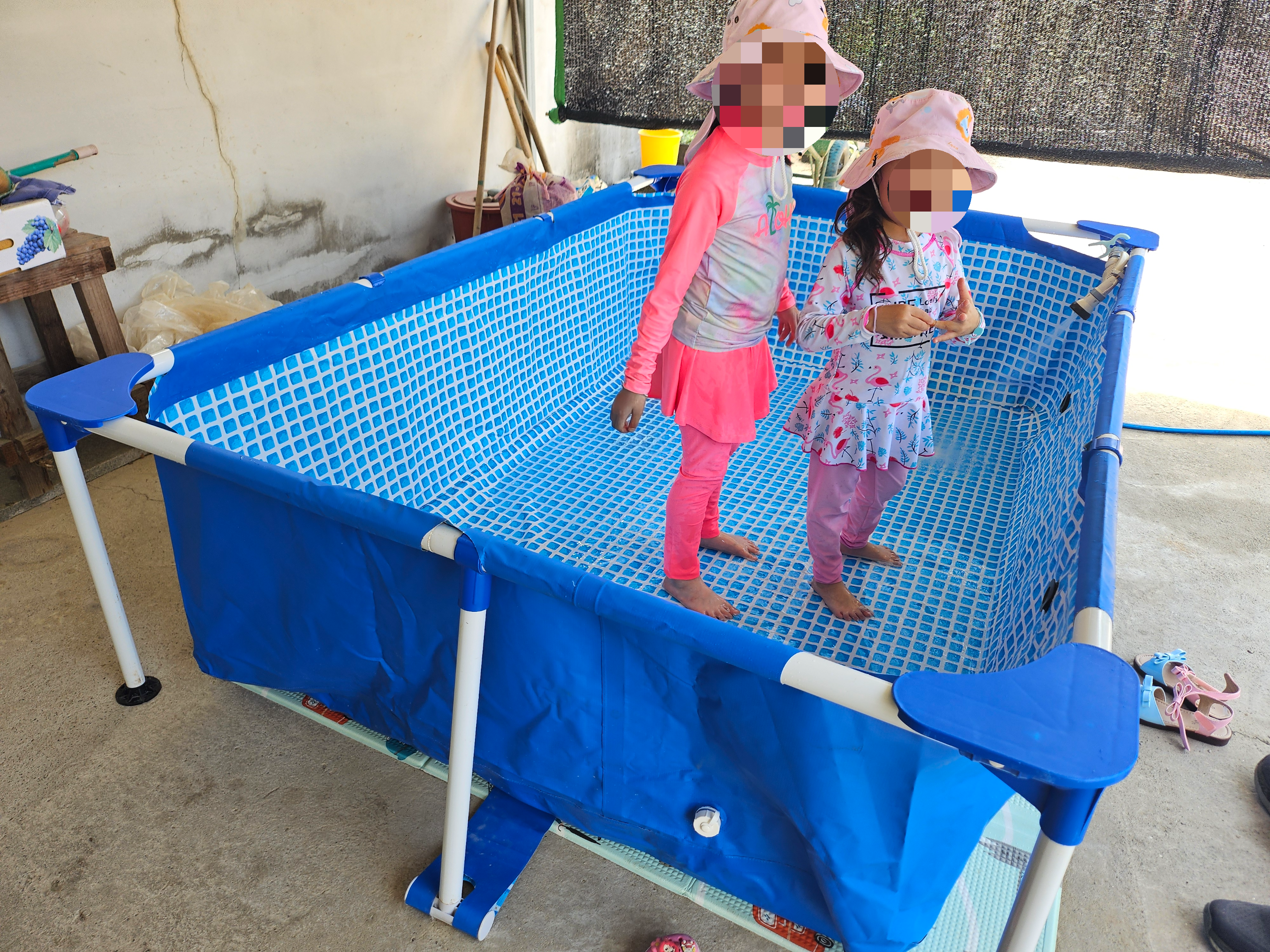 수영장의 설치와 철거는 뭐... 엄마와 아빠의 몫이었지만 두 딸아이들이 커감에 따라 이제는 제법 심부름도 곧잘 해주어서 이번 설치는 아주 손쉽게 할 수 있었습니다. 바닥이 콘크리트였기에 캠핑용 매트를 깔아주고 그 위에 수영장을 설치해 주는 삶의 지혜도 배울 수 있었습니다. (이건 아마 2년 차부터... 배웠던 ㅋ)