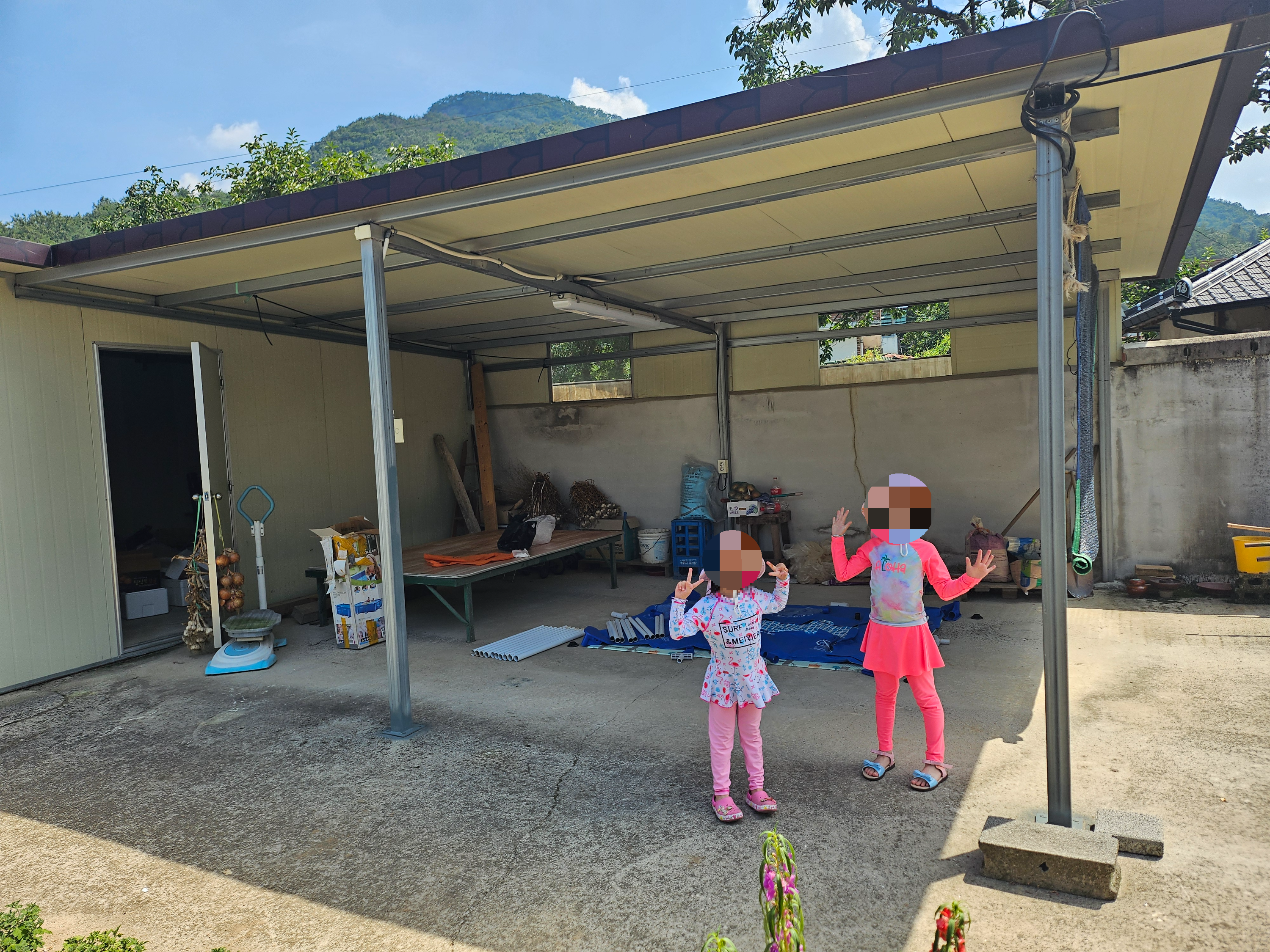 평소에는 아버님의 차량을 그늘에 두기 위한 구조물로 사용되고 있습니다만 여름 시즌에 두 손녀가 방문을 하면 직접 차량을 빼주시고 물놀이장으로 변모할 수 있도록 도와주십니다. 뜨거운 여름 햇빛을 피할 수 있는 그늘이 있기에 낮에도 당당하게 물놀이를 즐기는 두 딸아이들.... 너무 좋아라 합니다.
