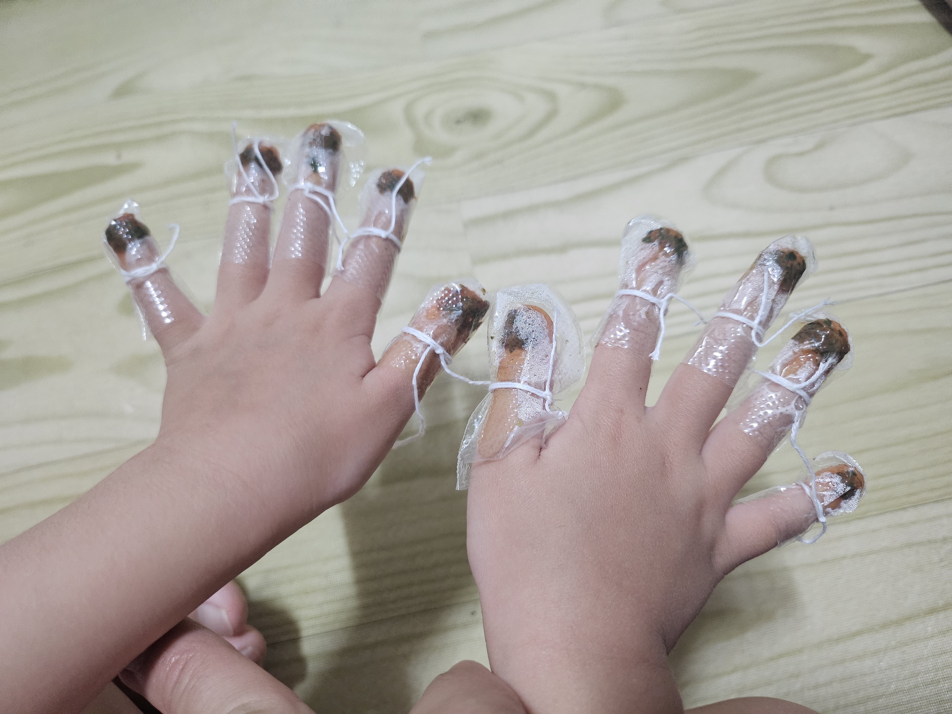 처갓집 마당에는 봉숭아 꽃이 2~3그루가 있었는데 와이프는 아이들과 꽃잎과 잎을 몇개 땄습니다. 잠들기 전 손톱에 봉숭아 물을 들여주고자 이니스가 열심히 미니 절구에 꽃잎과 잎, 그리고 백반 가루를 섞어 준비를 마치면 와이프가 아이들의 고사리 같은 손의 손톱에 조금씩 얹어 비닐에 감싸고 실로 묶어 주었습니다. 자는 동안 붉은색이 손톱에 잘 스며들기를 바라며 잘 때는 손을 배에 조심히 얹고 자도록 했습니다.