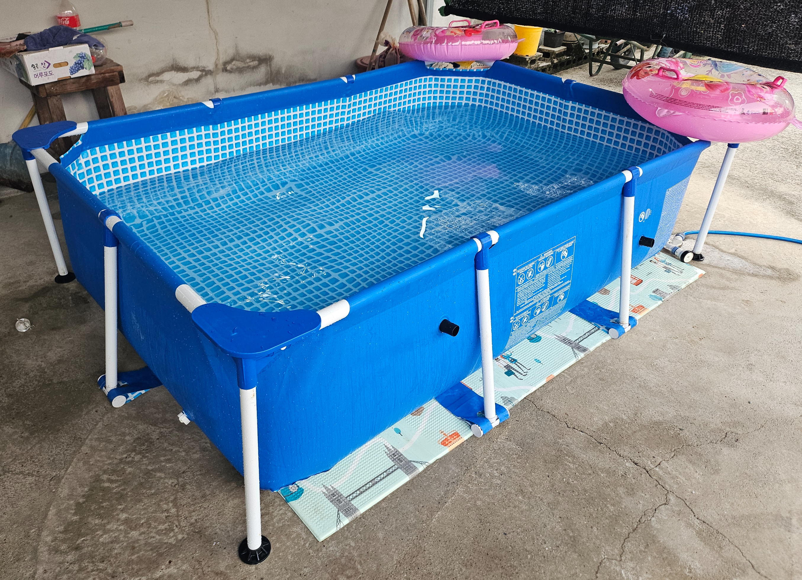 아이들의 물놀이장은 인텍스社에서 나오는 사각 프레임의 2.2m x 1.5m x 0.6m 짜리의 수영장을 애용하고 있습니다. 매해 여름마다 2~3일씩 물놀이장을 개장하고, 다시 보관하고, 여름에 다시 개장하고, 보관하고를 벌써 4년째 반복하고 있습니다. 새 제품을 사서 현재까지 아주 뽕을!! 뽑고 있습니다. 여름마다 제 역할을 톡톡히 해주고 있지요.