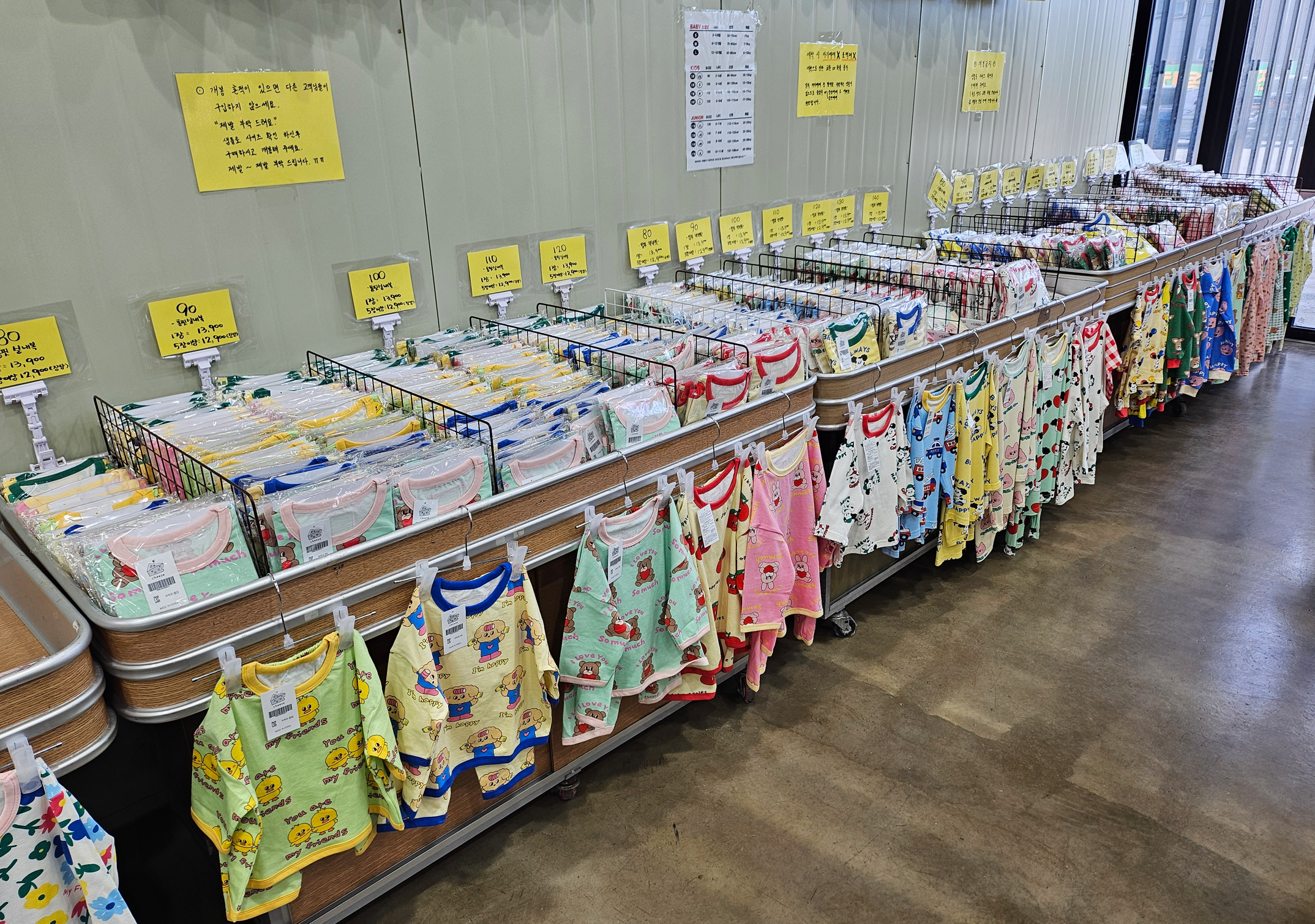 매장 곳곳에는 호수별, 사이즈별, 나이별, 신장별, 체중 별