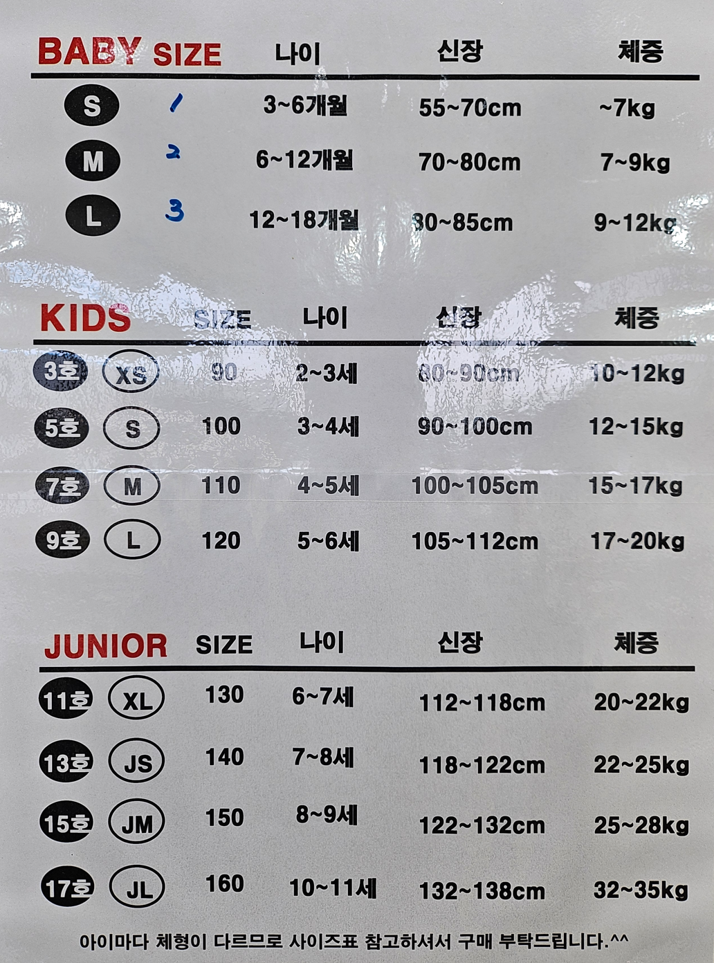 아이들의 옷 사이즈를 판단할 수 있도록 정보를 게시해 주셔서