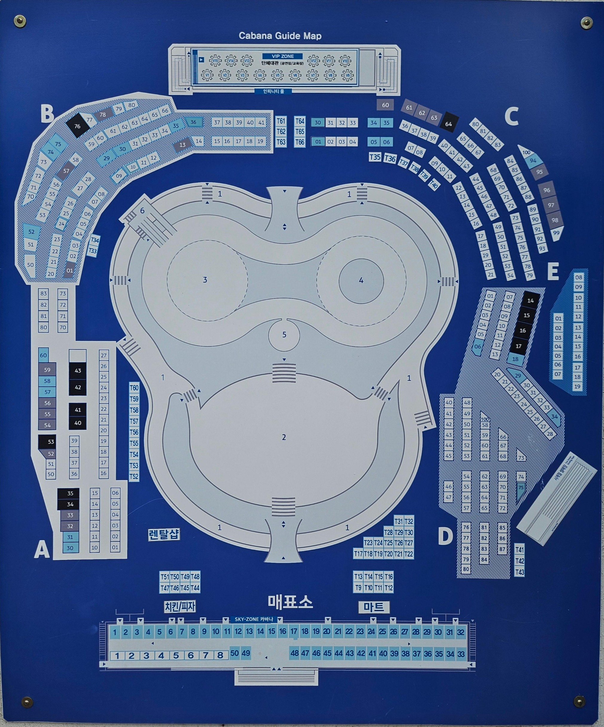 원숭이 얼굴처럼 생긴 풀장을 기준으로 양 옆으로 카바나와 테이블이 있었고, 메인 건물과 맞은편 건물에는 매점과 푸드코트 등이 있었습니다.