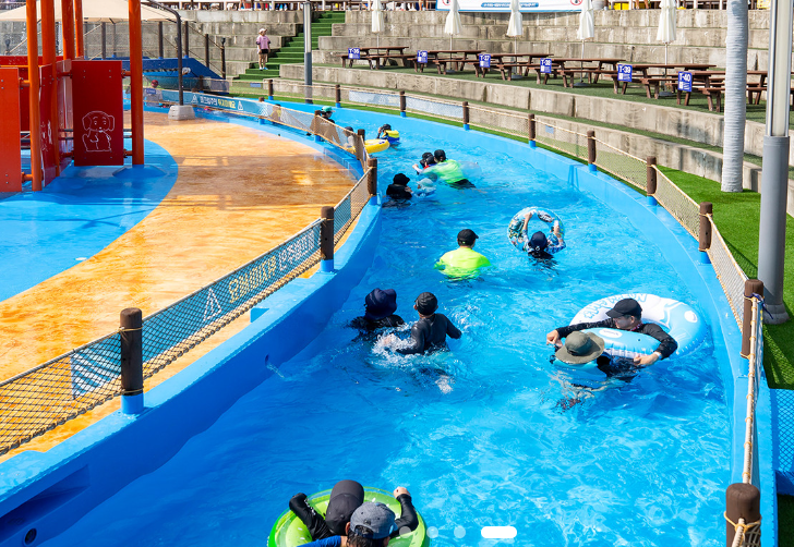입구에 들어서면 마스코트인 '아라' 캐릭터를 만나볼 수 있습니다. 그 뒤로 가족들이 함께 놀 수 있는 가족풀이 있습니다. 아라 캐릭터가 서 있는 곳에서 DJ, 마술 공연 등이 진행이 되니 꼭! 공연 시간을 확인하셔서 함께 즐겨 보세요~