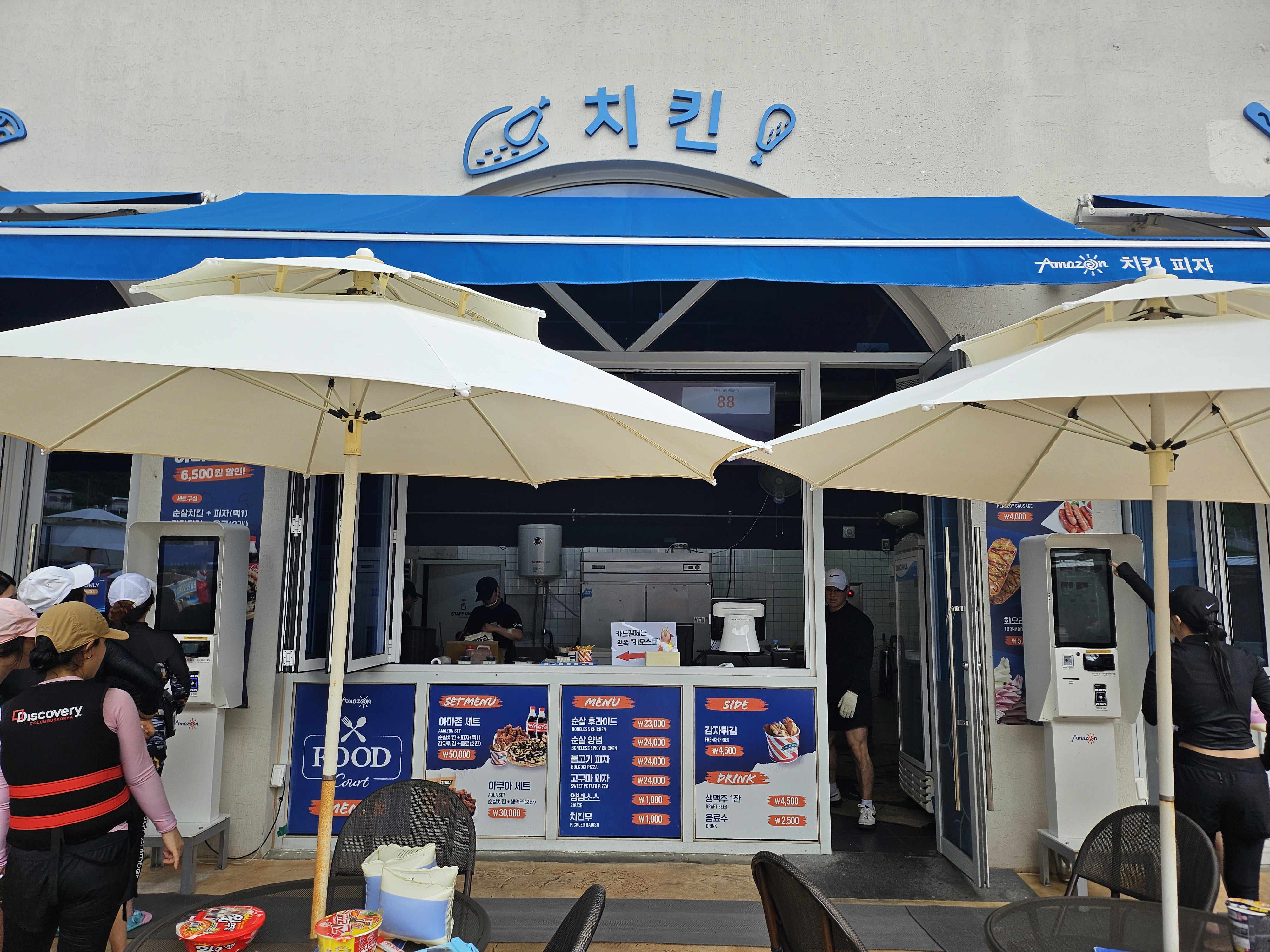 음식을 판매하는 푸드코트와 스낵, 매점, 그리고 남녀 탈의실/화장실이 매표소 건물에 있었습니다. 카바나에서 직접 조리를 해서 식사를 할 수도 있지만 이곳 푸드코트와 매점을 이용하여 식사를 해결할 수 있었습니다. 이니스의 가족도 세트 메뉴를 시켜서 피자+치킨으로 점심을 해결하였는데 피자의 도우가 패스트츄리 방식으로 되어 있어 두 딸아이는 겹겹이 쌓인 빵을 뜯어먹으며 배를 채웠습니다.