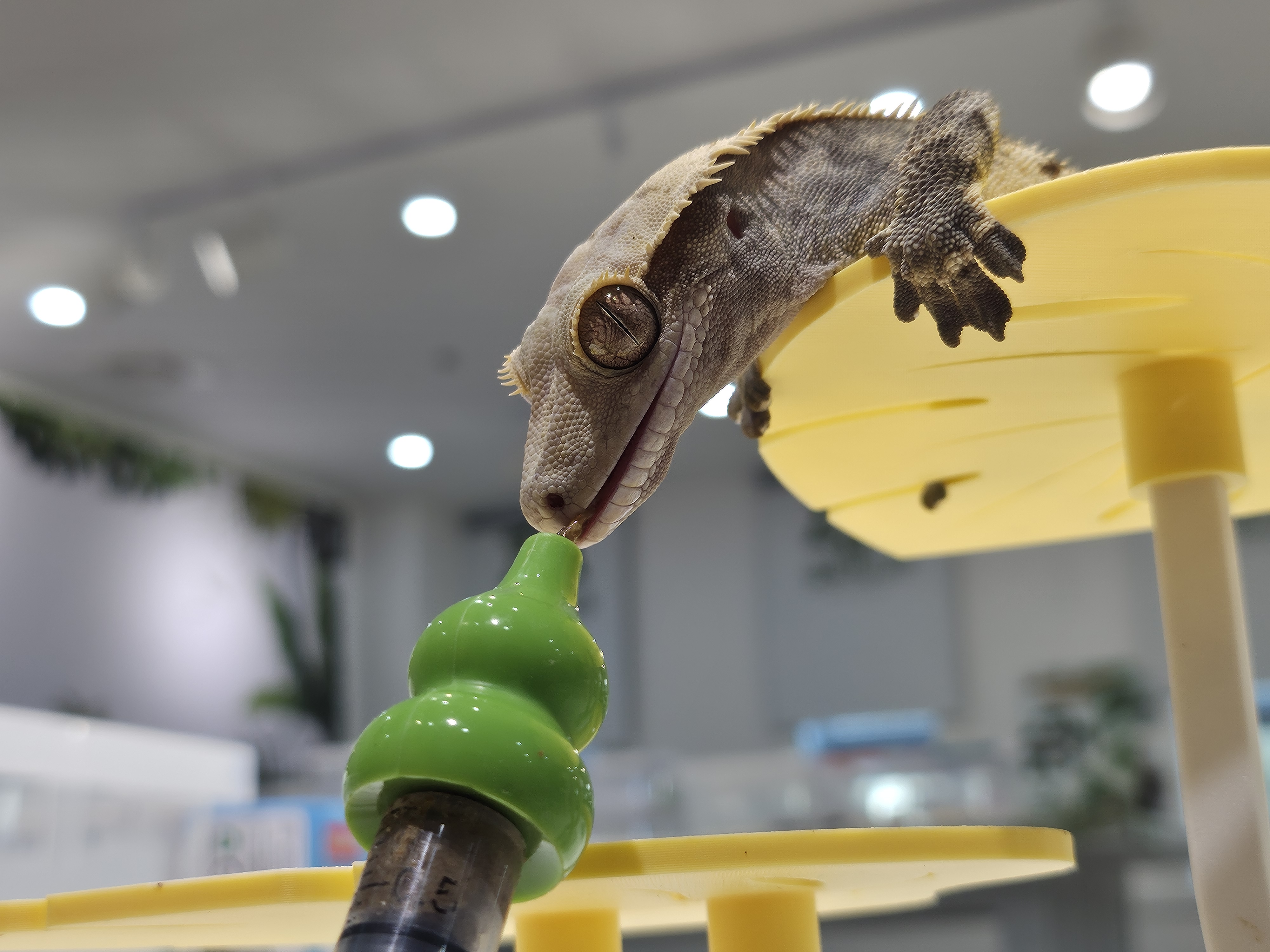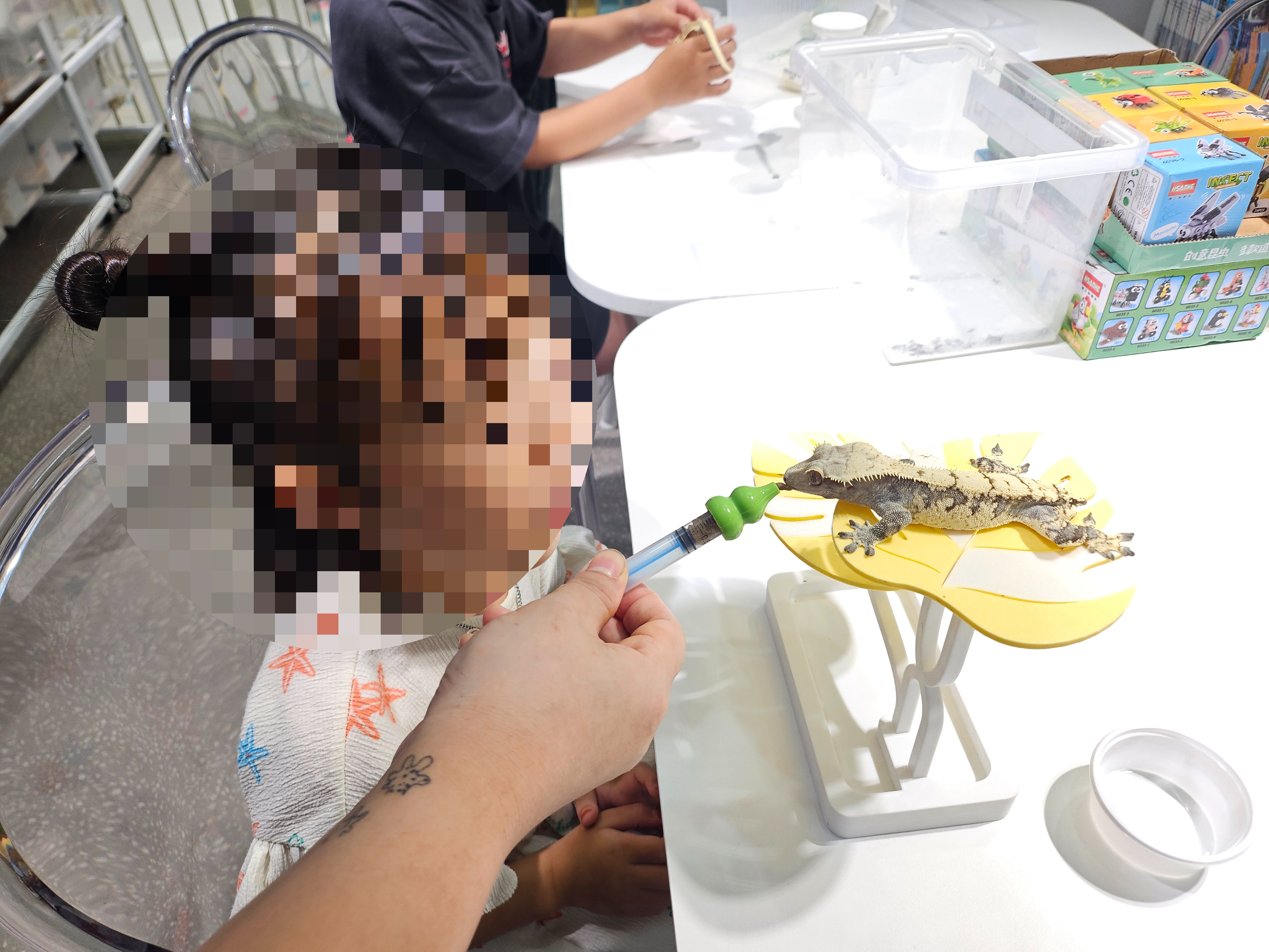 다음으로 도마뱀 먹이 주기 체험도 했답니다. 카운터 옆에 안내가 있듯이 영수증 리뷰를 해서 1개를 받고, 1개는 구매를 해서 총 2개의 먹이(주사기에 담겨 있습니다.)를 받아 지정된 장소에 가서 앉아 있으니 사장님이 성체 도마뱀을 직접 전달해 주셨습니다. 두 딸아이는 자기 앞에 있는 도마뱀에게 주사기를 짜서 도마뱀의 입 앞에 조금씩 짜주며 먹이를 주며 도마뱀과 교감하는 모습을 보여주었네요.