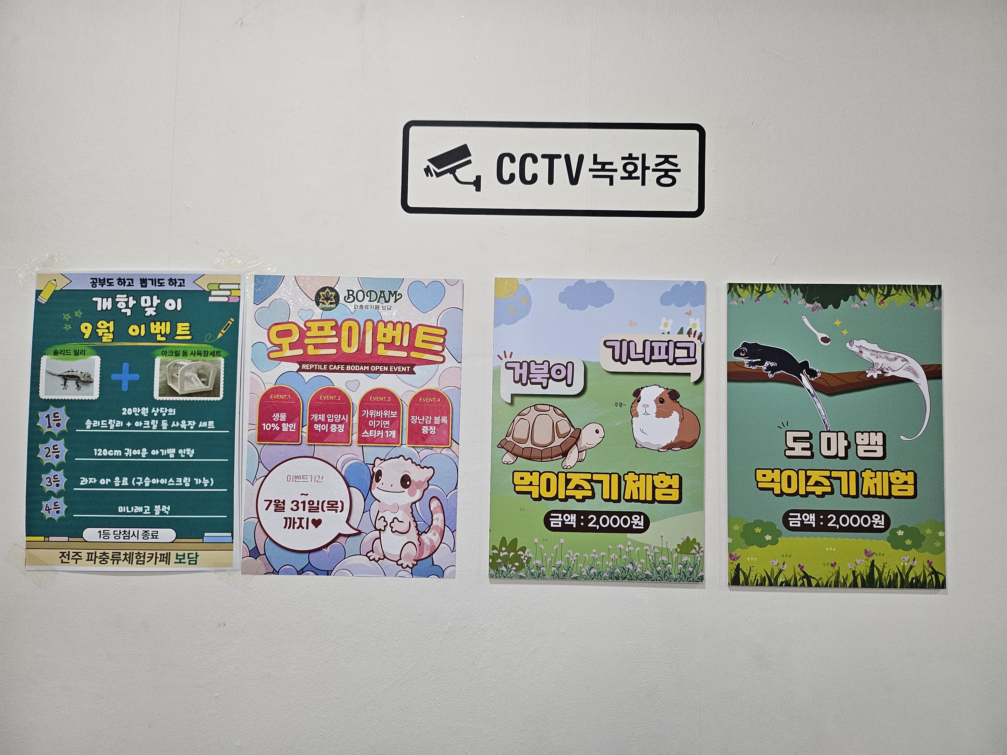 카운터 앞과 옆에는 안내문들이 있었습니다. 이제 곧 9월인데 이벤트가 진행되는 내용과 도마뱀뿐만 아니라 다른 식구들(거북이, 기니피그, 돼지 등)의 먹이 주기 체험비용을 안내해주고 있었습니다.