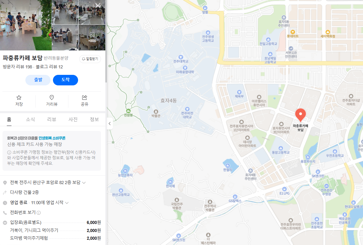 파충류카페 '보담'은 전북 완산구에 있습니다. 근처 주거 단지가 많이 밀집해 있는 곳으로 파충류를 좋아하고, 경험해보고자 하는 부모님들이 아이를 데리고 오기에 적합한 장소에 있었습니다.