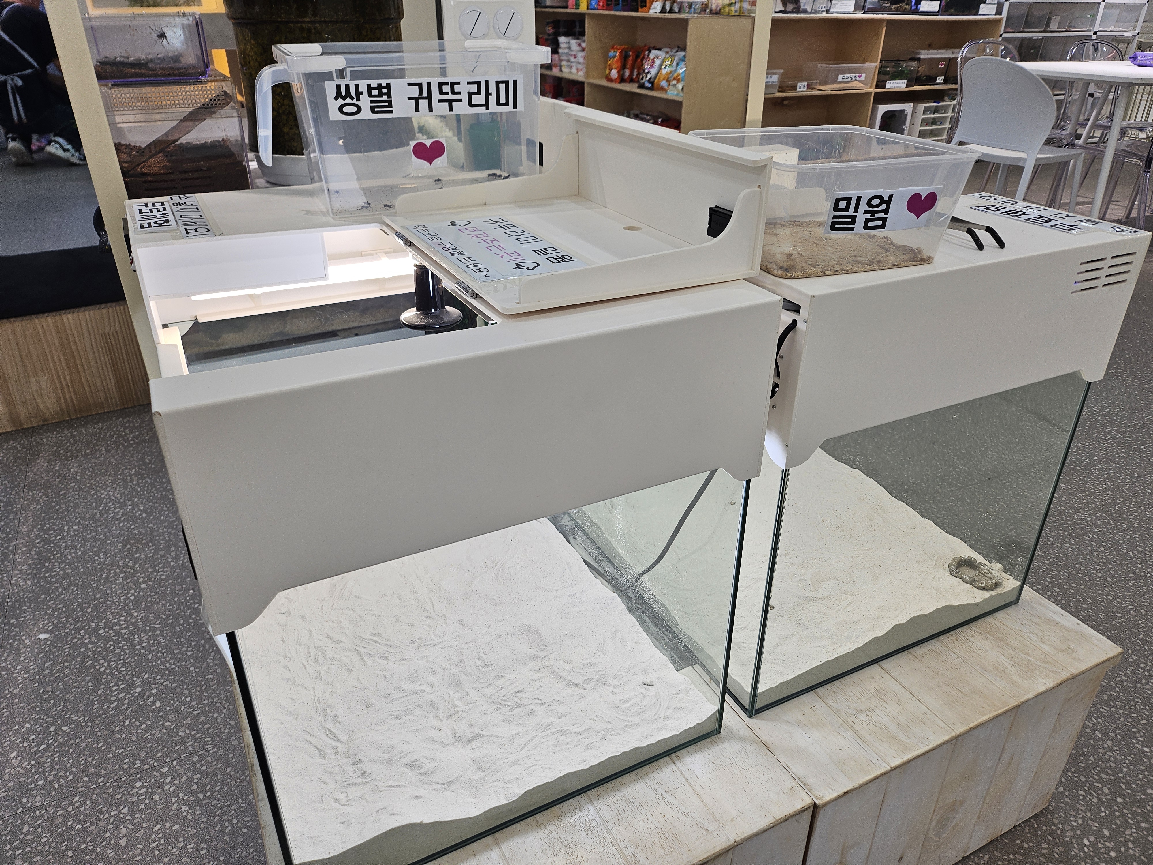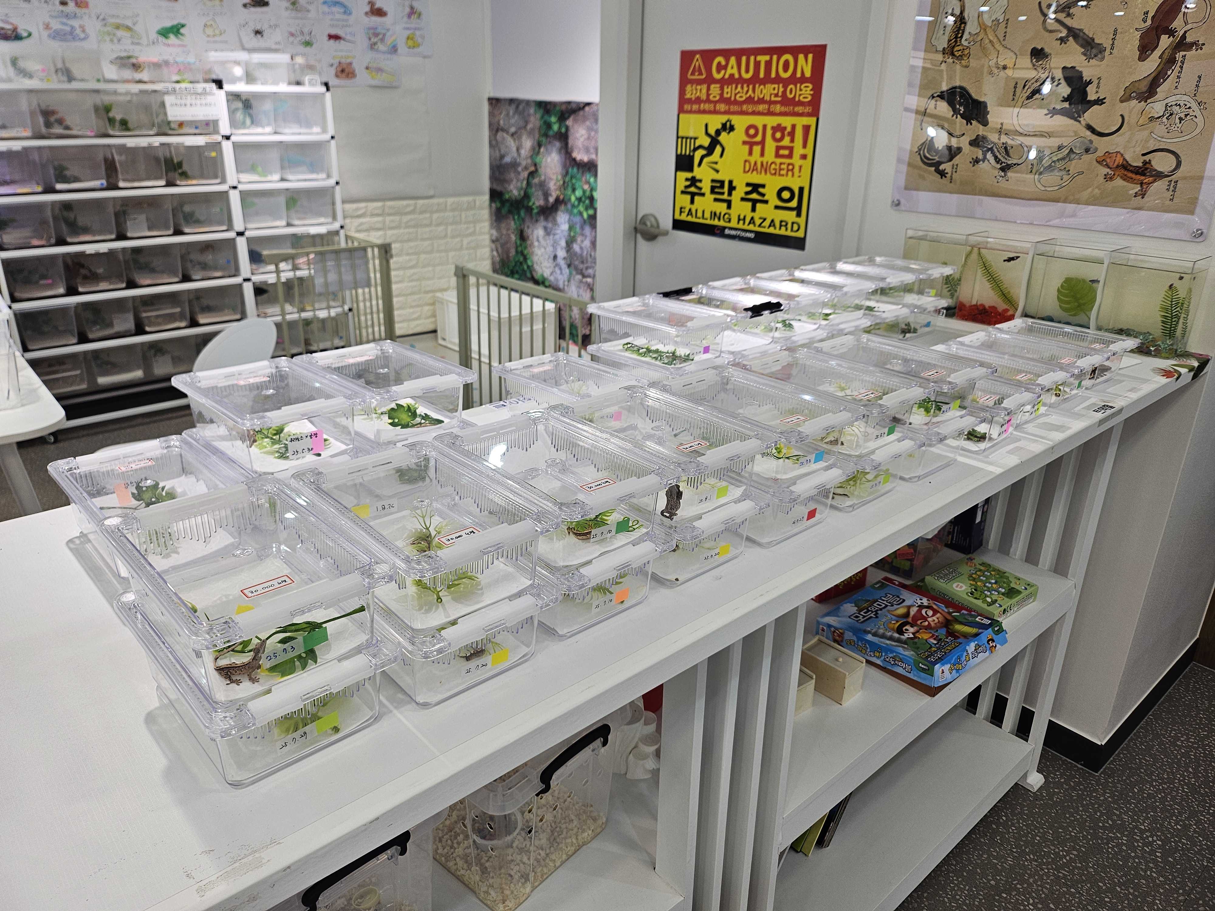 이곳은 성체 도마뱀이 있는 곳이었습니다. 케이지를 잘 보면 하트모양이 붙어 있는데... 하트가 붙어 있는 케이지의 도마뱀은 사장님께 요청하면 직접 도마뱀이나 다른 파충류를 꺼내서 직접 만져보고 피부로 느껴볼 수 있도록 해주셨습니다. 두 딸아이도 '이 도마뱀 주세요~, 저 도마뱀 주세요~' 사장님을 귀찮게... 했습니다.