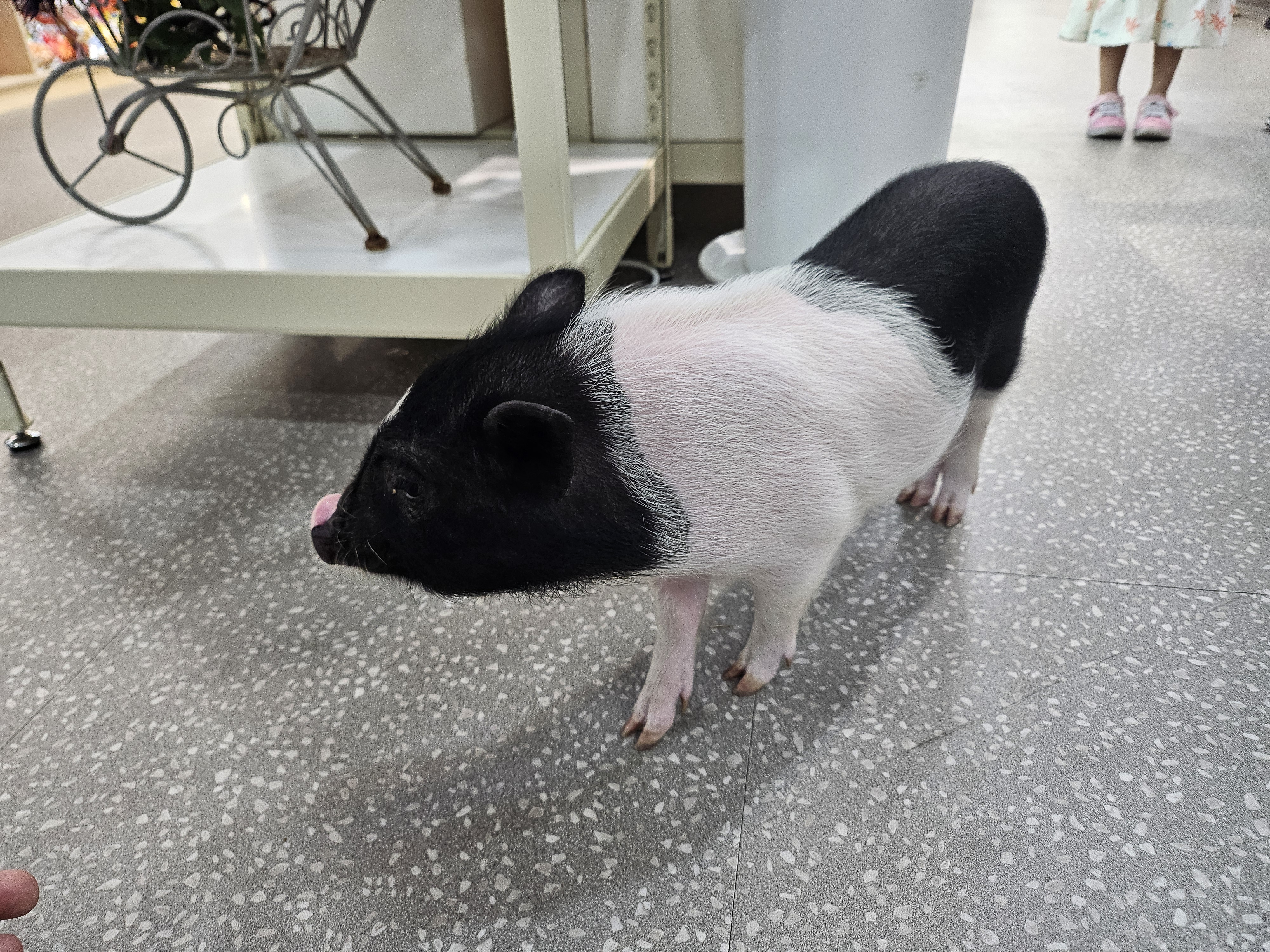 이곳은 파충류 카페이지만 우리 이니스 가족을 먼저 반겨주는 것은 바로... 베이비 피그~! 였습니다. 돼지 케이지가 있었지만 매장 곳곳을 자기 집처럼 활보를 하고 다녔습니다. 특히 동물 먹이체험을 할 때는.... 당근을 한 번이라도 더 받아먹겠다고 두 딸아이를 졸졸 따라다니며 간식을 받아먹고 다녔지요..