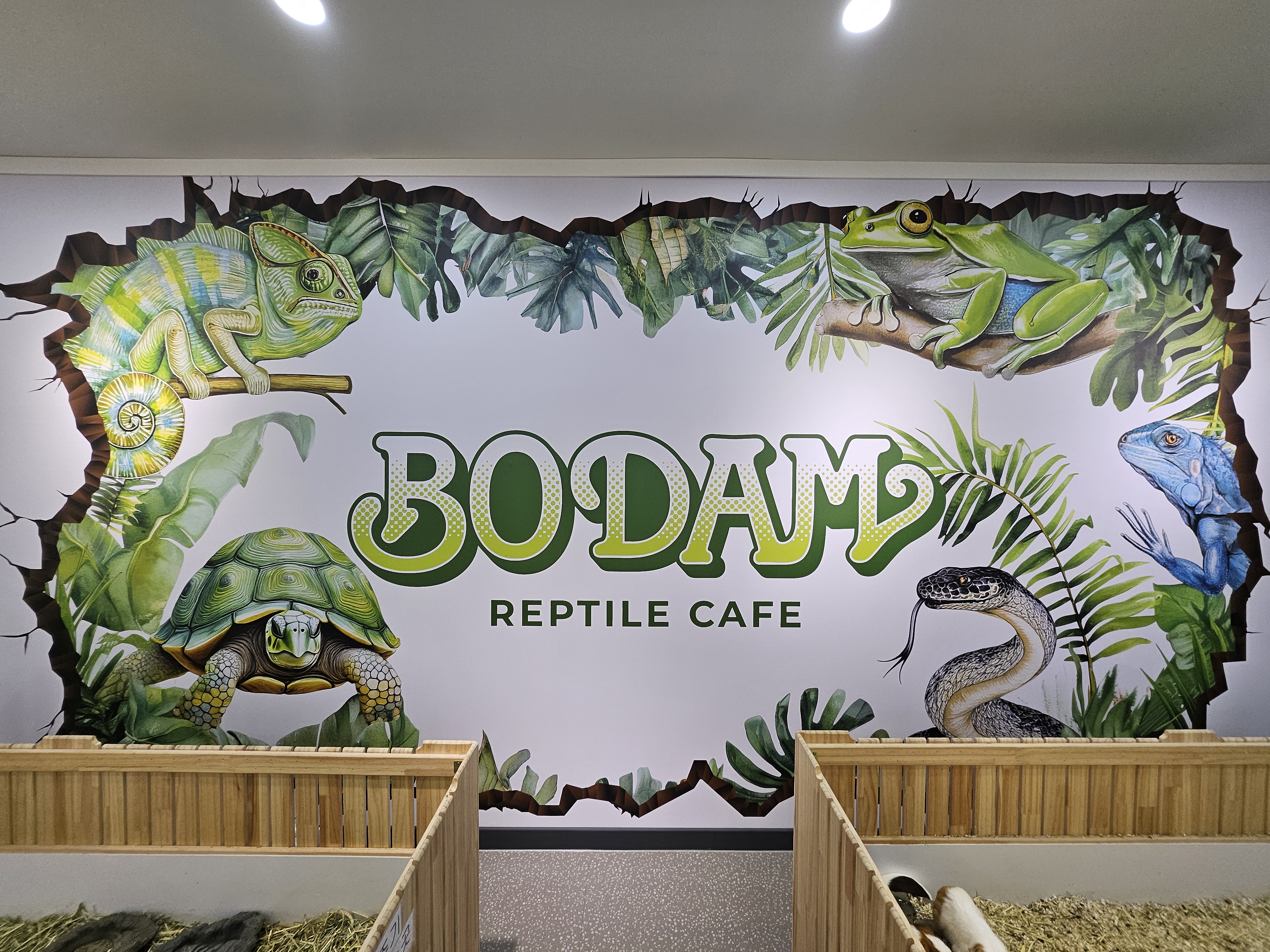 매장에 들어가면 기니피그와 사막거북이 우리가 있고, 그 벽면에 카페의 이름인 'BODAM_Reptile Cafe'라는 벽 그림을 만나볼 수 있었습니다. 매장의 파충류 식구들 모두를 표현하고 있었습니다.