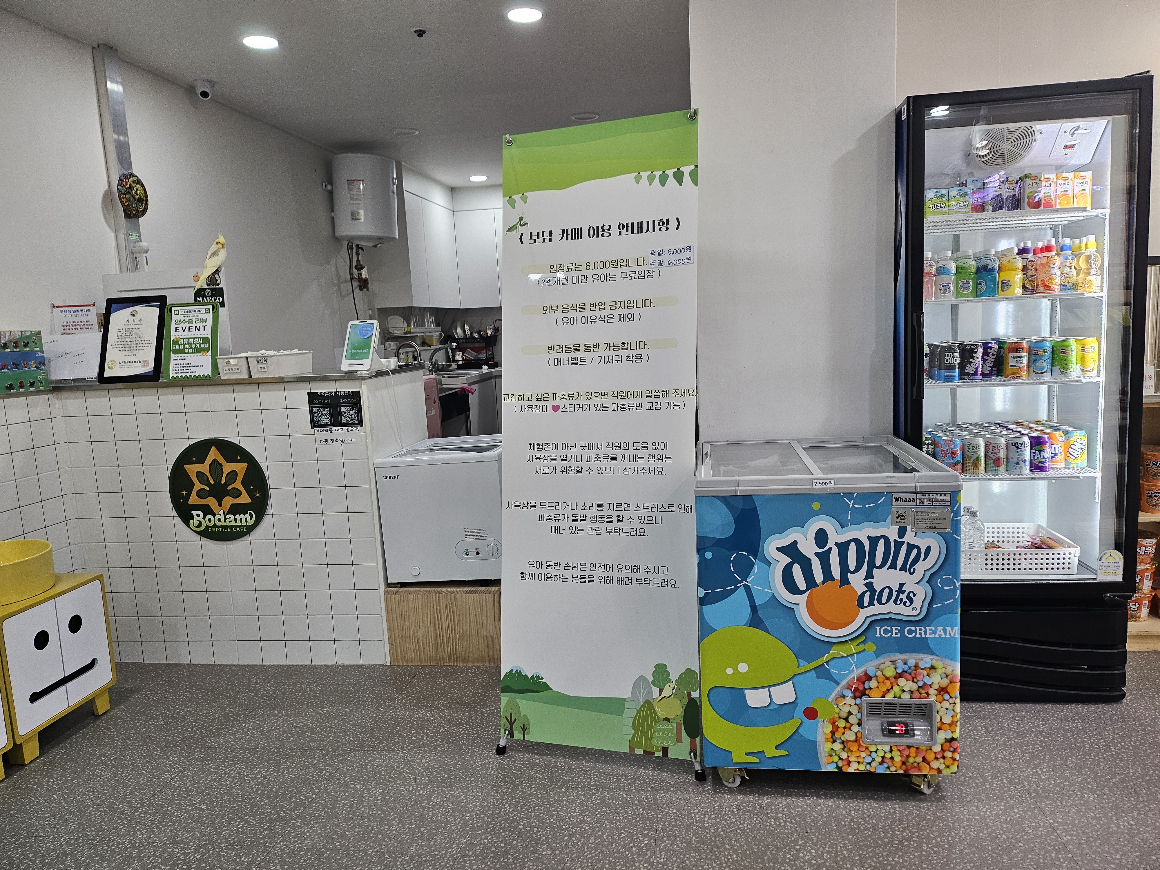 카운터에는 파충류카페를 운영하시는 사장님의 "양서푸충류관리사 3급'이라는 자격증을 전시해주고 있어서 전문가의 느낌이 물씬 느낄 수 있었습니다. 참... 영수증 리뷰를 하면!! 도마뱀 먹이 주기 1회가 무료이니 꼭! 해보시길 추천드립니다.