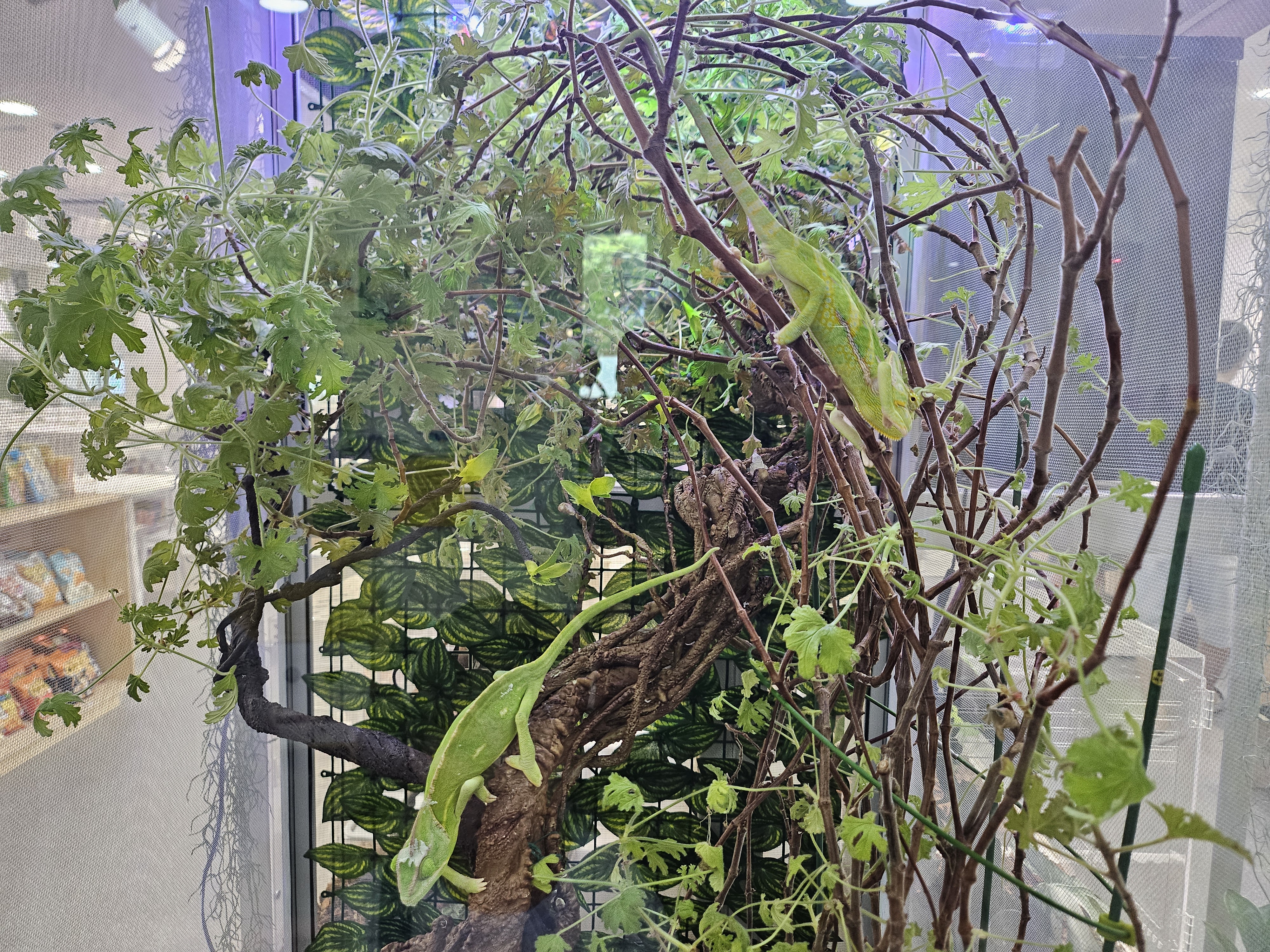 매장을 들어서서 카운터를 지나면 바로 만나 볼 수 있는 것은 바로 두 마리의 카멜레온이었습니다. 나뭇가지와 녹색 잎이 있었는데 처음엔 어디 있나?? 찾아보다가 보호색 때문에 쉽게 찾아지지 않았습니다. 매장에 방문한 아이들이 많아지니 사장님께서는 카멜레온에게 먹이를 주며 아이들의 관심도를 높여주기도 했습니다.
