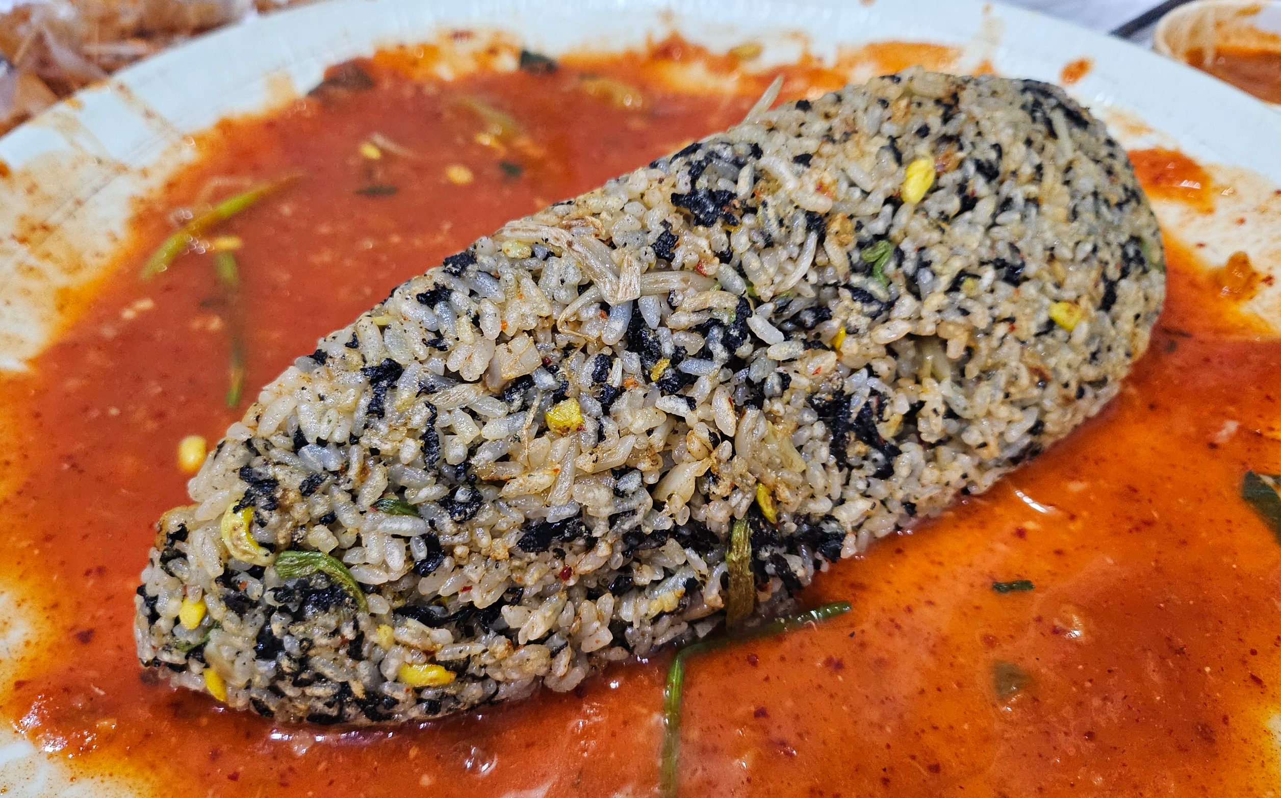 많을 것 같은 아귀찜을 다 먹고난 뒤 먼가 아쉬움이 있었습니다. 보통 양념이 있는 곳에는 볶음밥이 있기 마련인데 이곳에서 볶음밥 3개를 주문하니 이모님이 아구찜 양념을 일부 가져가시곤 5분 뒤에 이렇게 기다란 삼각김밥을 가져다주셨습니다. 너무도 특이해서 마냥 신기하게 바라보다가 한 숟가락을 들었습니다. 밥풀 하나하나 볶은 느낌처럼 탱탱해서 식감이 너무 좋았고, 적당한 양념이 너무 일품이었습니다.