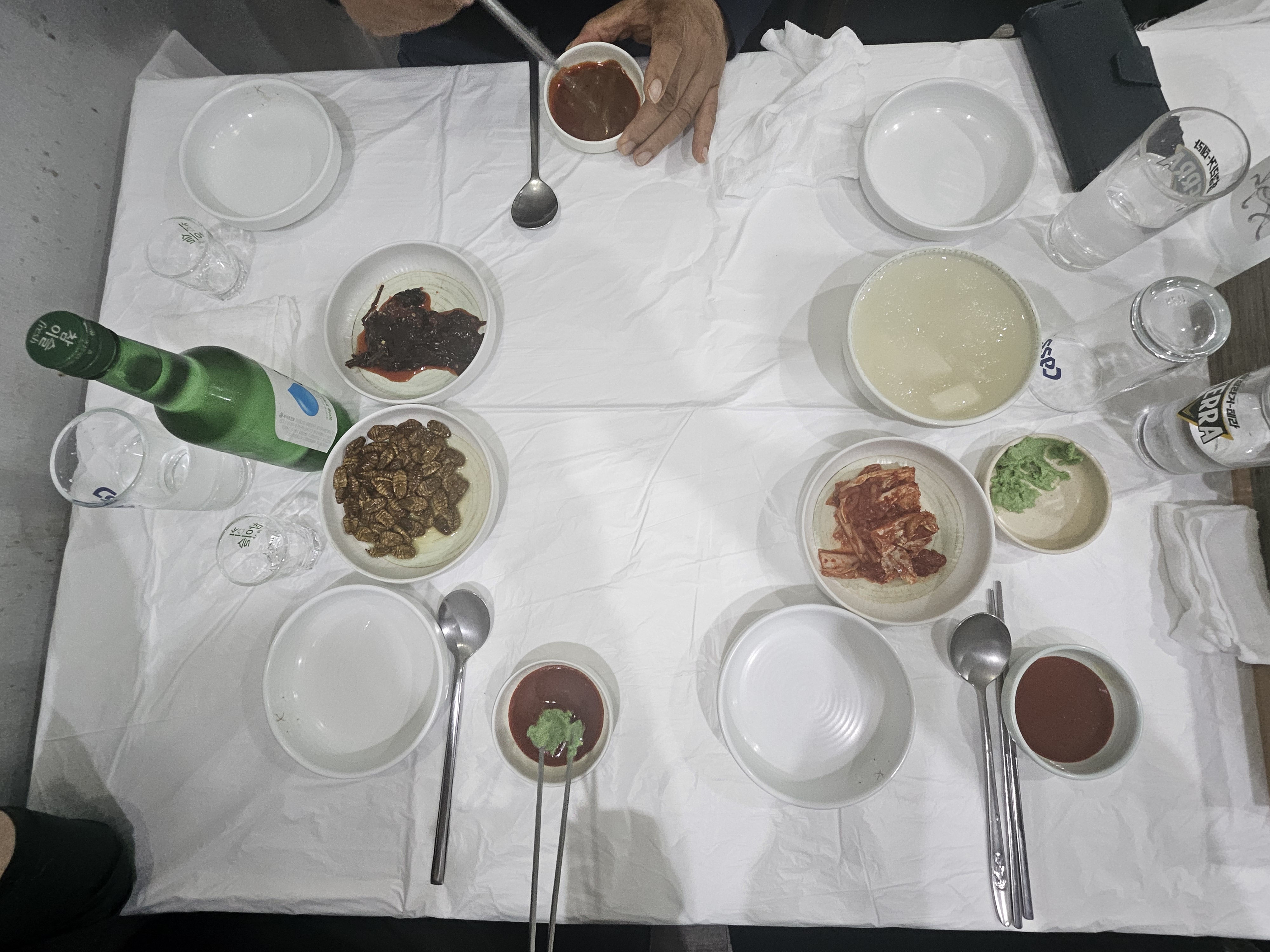 음식을 기다리는 동안 서빙해 주시는 이모님이 테이블을 준비해 주셨는데 밑반찬으로 나온 번데기가 너무 고소하고 맛이 있어서 직접 일어나 조리실로 가서 한 접시 더!! 를 요청해서 먹었네요.
