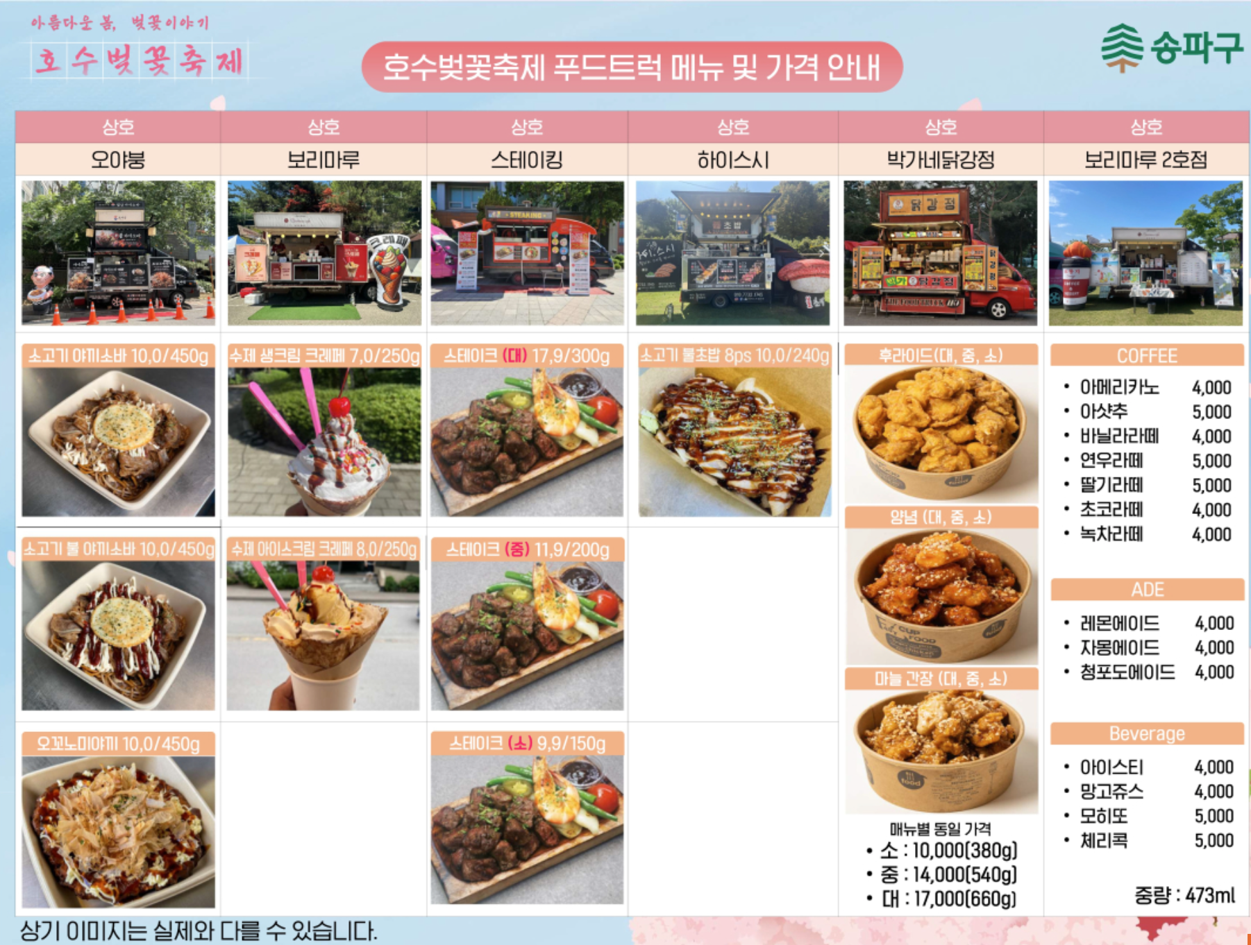 벚꽃 라떼, 벚꽃 아이스크림 등 특별한 먹거리를 제공하는 푸드트럭이 축제 방문객의 허기진 배를 채워줄 것입니다.