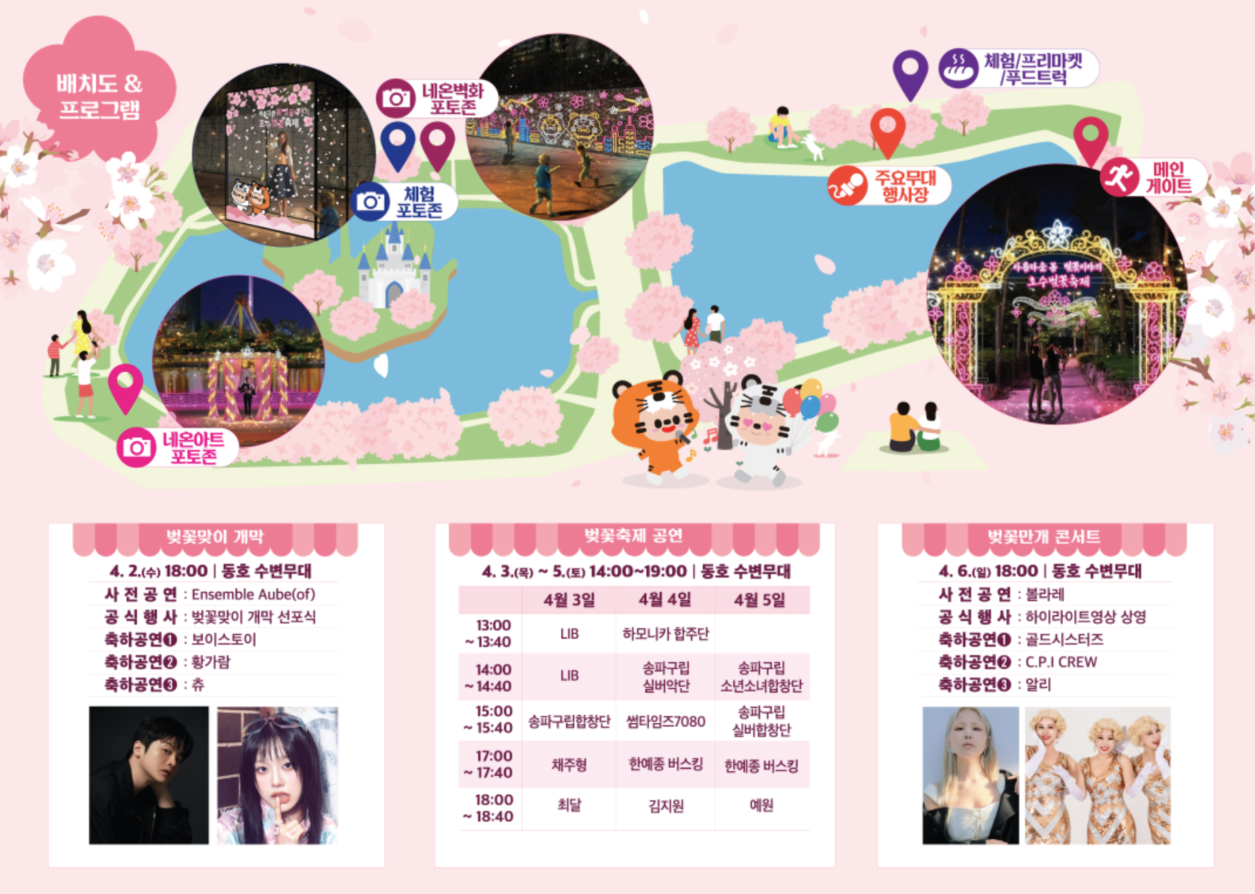 축제 일정은 벚꽃 개화 시기에 따라 변동될 수 있으므로, 방문 전 송파구청 공식 홈페이지를 통해 최신 정보를 확인 하시기 바랍니다.