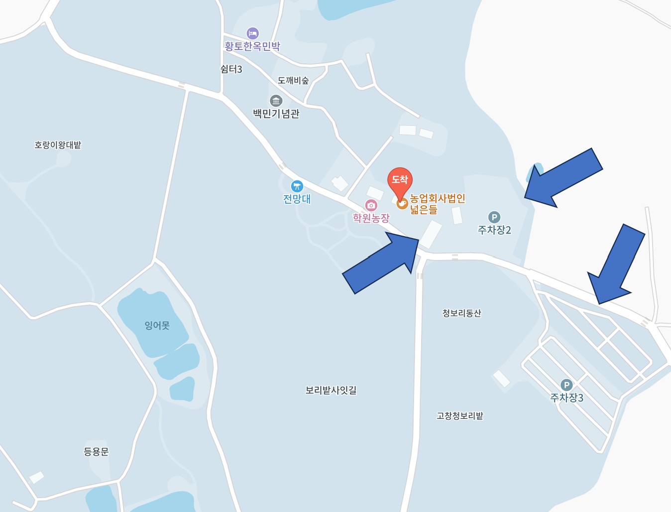 ▷ 자차 이용 시 : 내비게이션에 '학원농장' 또는 '청보리가든'으로 검색하시면 됩니다.