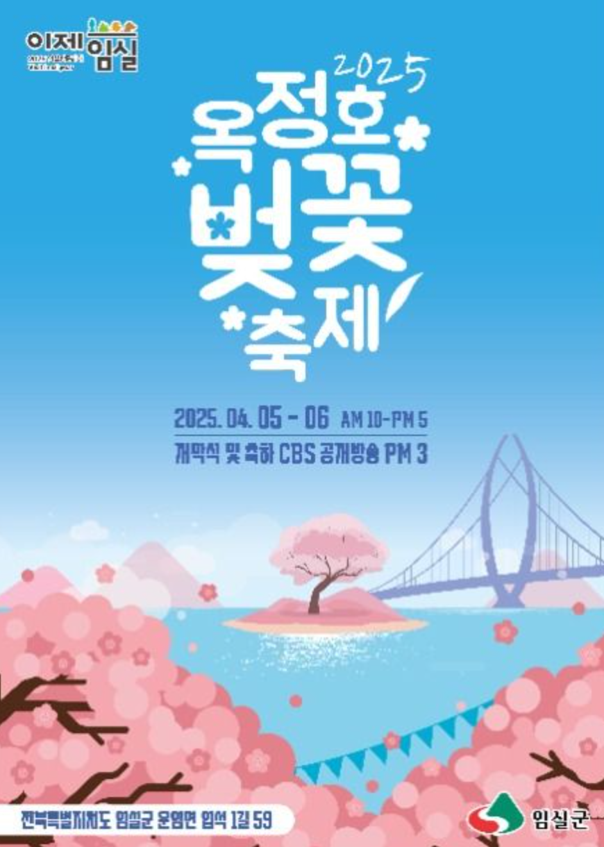 2025년도 임실방문의 해를 맞아 열리는 공식 첫 행사로 전라북도 임실군 옥정호 일대에서 열리는 '옥정호 벚꽃축제'에 대한 소개를 드려봅니다. 옥정호 주변 10km의 수변 길을 따라 심어진 벚꽃나무들로 이루어진 벚꽃길은 '대한민국 아름다운 길 100선'에 들 정도로 아름다운 경관을 자랑합니다. 2025년 4월 5일(토)부터 4월 6일(일)까지 옥정호 출렁다리 앞 특설무대와 붕어섬 생태공원 일원에서 개최되며 유명 가수들의 축하 무대와 옥정호 데크길을 중심으로 아트풍선, 페이스페인팅, 인생 사진을 촬영할 수 있는 경험을 할 수 있습니다. 또한, 한우국밥, 섬진강 다슬기 수제비, 치즈 붕어빵 등 임실만의 먹거리가 준비되어 있으니 시간을 내어 옥정호 벚꽃 축제를 즐겨보심이 어떨까 합니다.