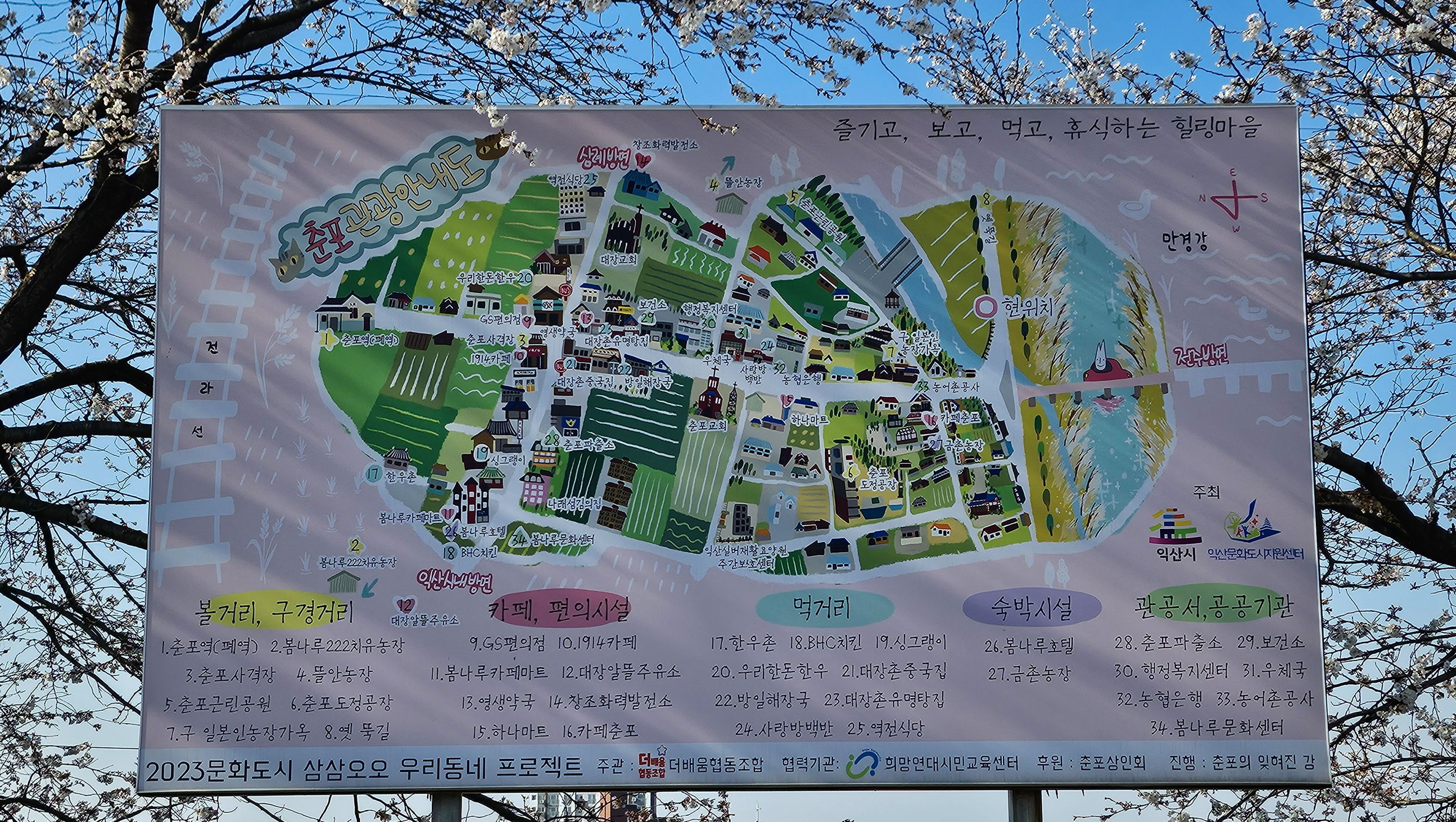 춘포 지역을 지날 때 그 지역에 맛집, 구경거리 등을 알록달록하게 소개해 둔 지도인 '춘포관광안내도'를 만날 수 있었습니다.
