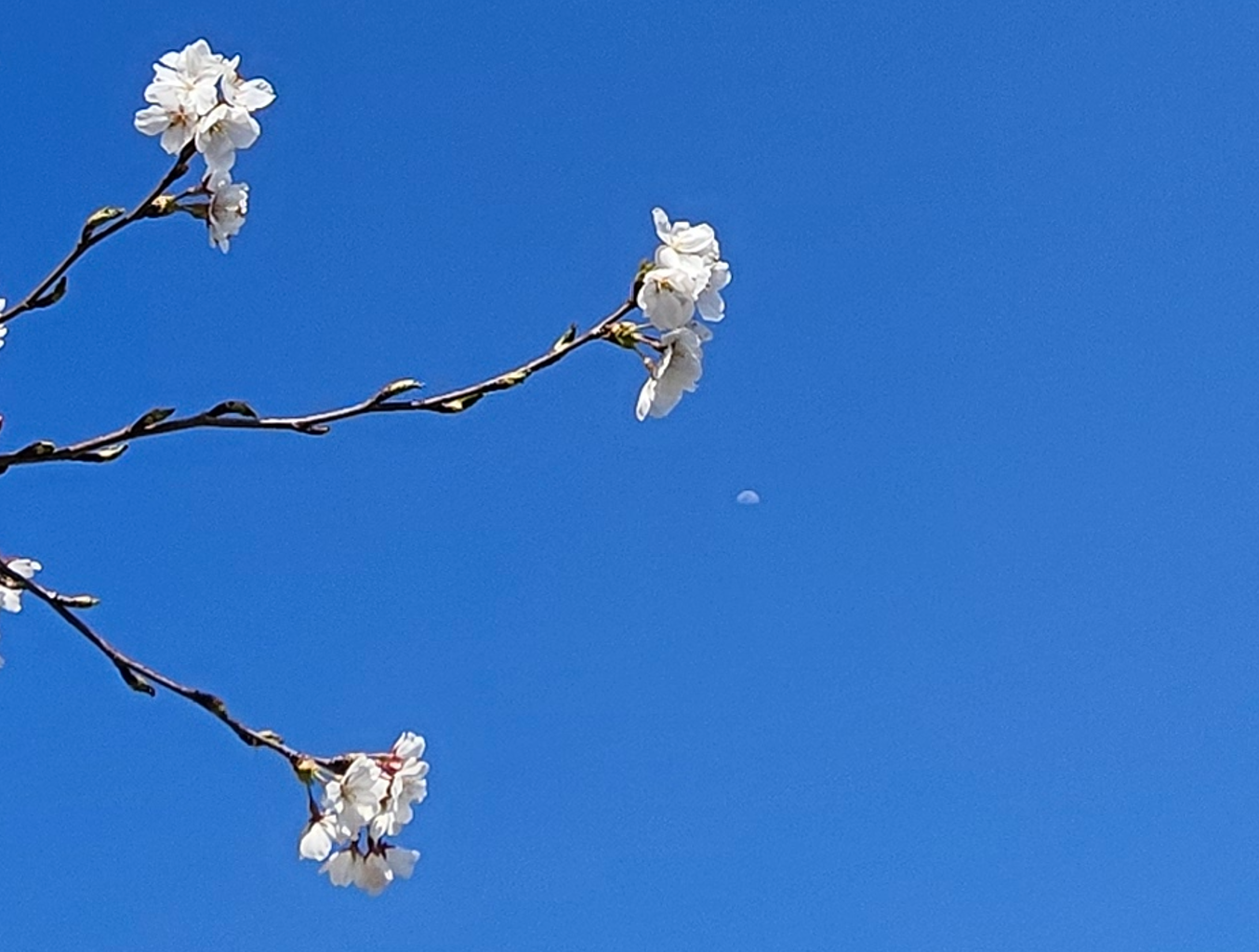 낮인데도 선명하게 보이는 반달이 벚꽃 구경을 나온 사람들을 구경하는 듯이 구름 한 점 없는 파란 하늘에 떠 있었습니다.