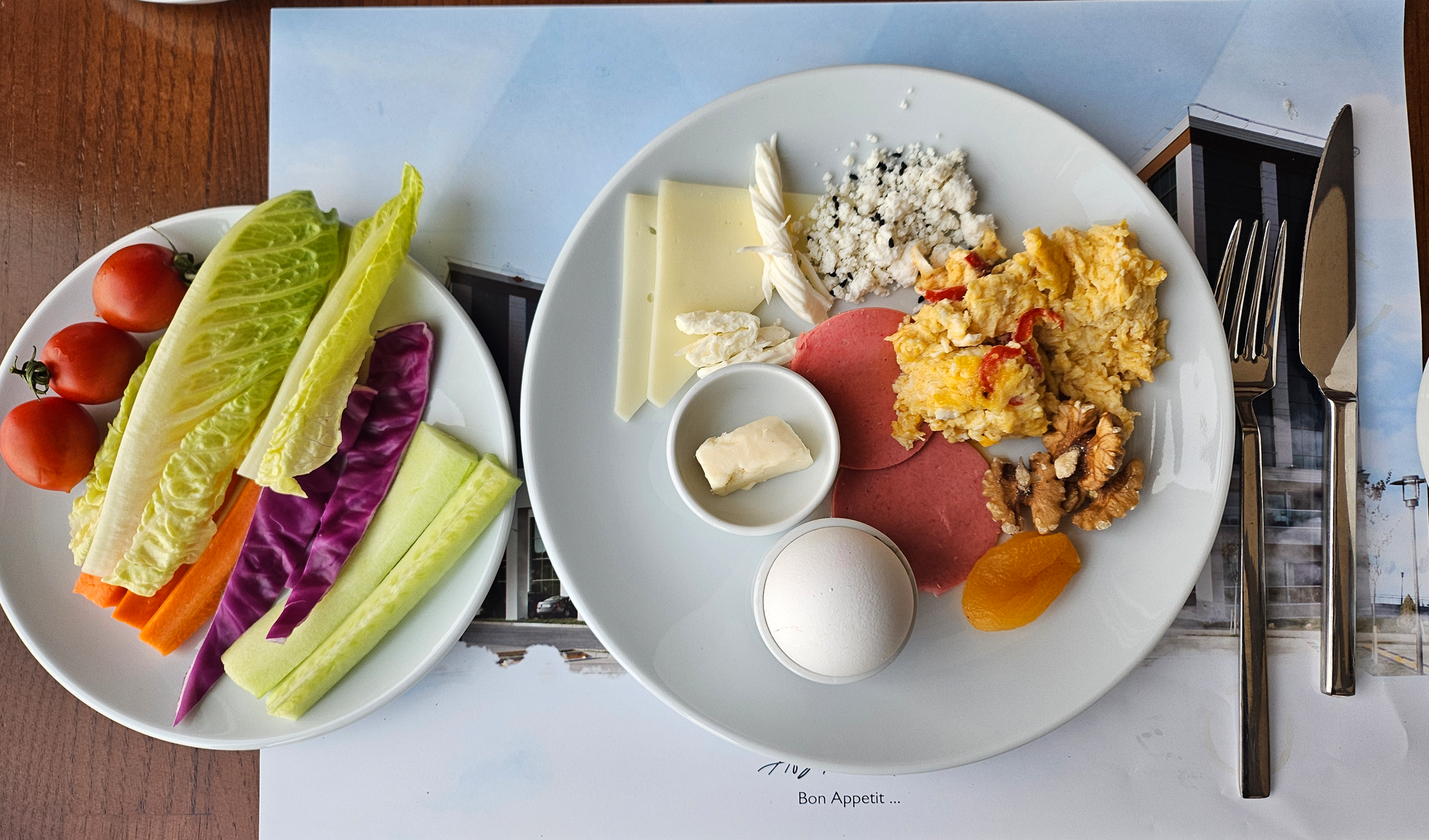 아침은 7:00에 내려가서 식사가 가능했고, 아래 그림과 같이 치즈, 빵, 에그 스크램블, 야채, 꿀 등이 준비되어 있습니다. 호텔 숙박비용에 조식이 포함되어 있어 여유 있게 내려와서 먹고 싶은 음식을 쟁반에 담아 허기진 아침 배를 채워봅니다.