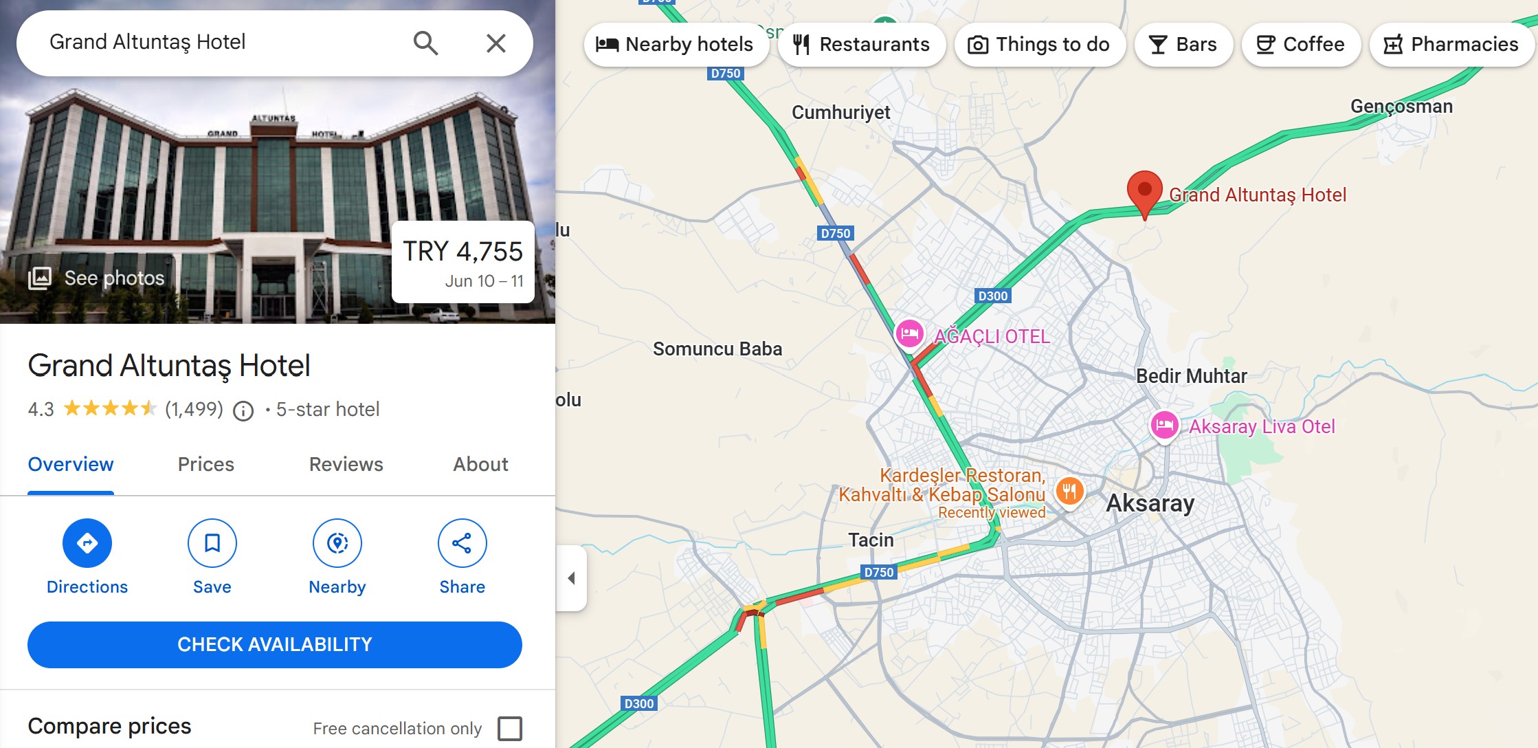 그랜드 알튼타쉬 호텔은 악사라이에서 북서쪽 언덕 위에 자리 잡고 있습니다. 튀르키예 하면 다들 들어보셨을 '카파도키아'라는 곳으로 가는 길목에 있지요. 회사 업무를 하러 가는 곳이 편도로 90km 정도 떨어져 있는데 그나마 깔끔하고 회사 규정에도 알맞은 가격에 머무를 수 있기에 현지 업체의 도움을 받아 예약을 잡았습니다.