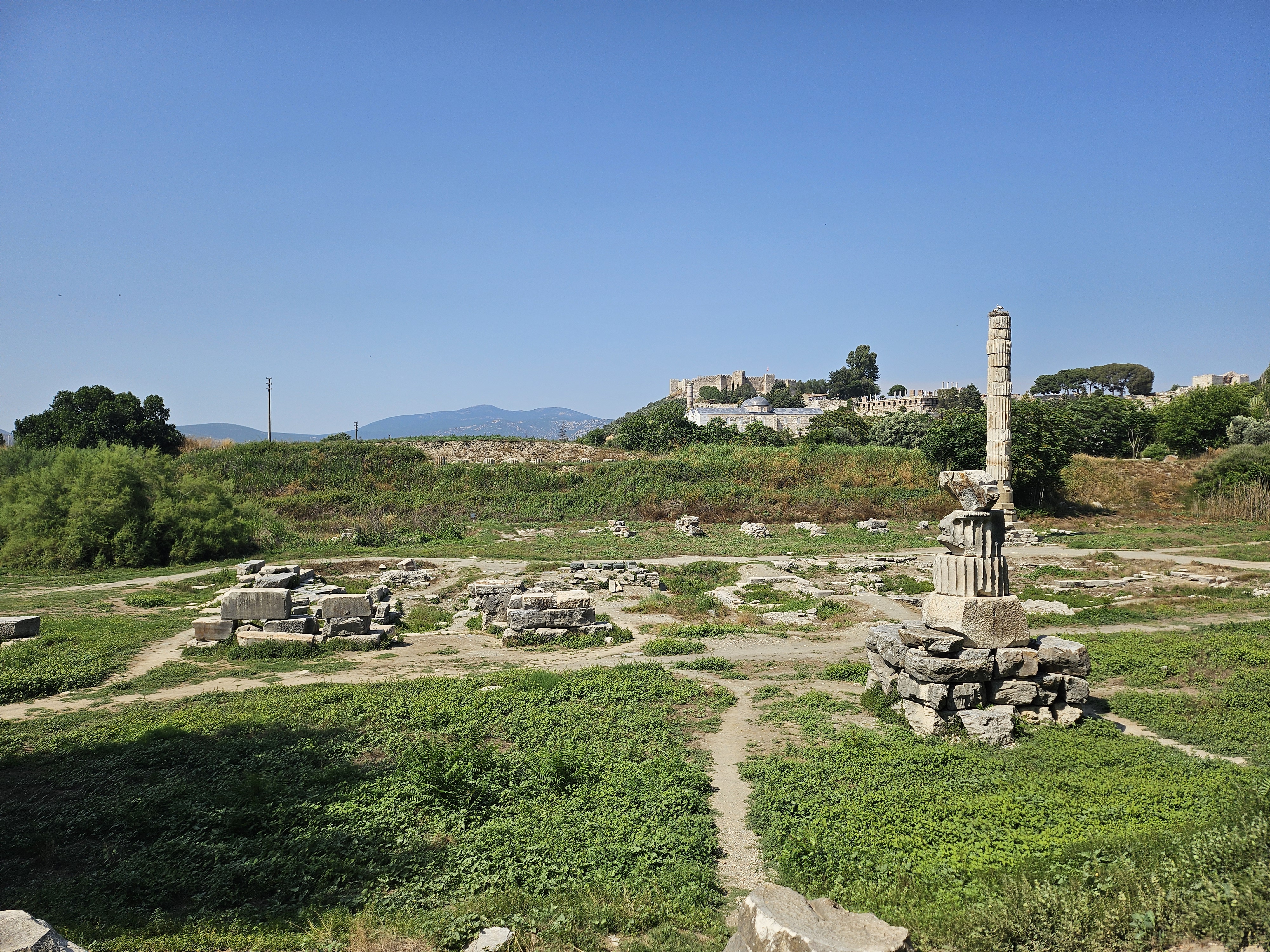 큰 길에서 멀지 않은 거리에서 만나 볼 수 있는 아르테미스 신전 유적지에서는 뒤로 아야술룩 성을 배경으로 주축 기둥의 돌을 두었을 것으로 예상되는 받침대와 함께 우뚝 솟아 오른 기둥 하나만이 남아 있었습니다. 그리고 신전의 규모나 신전에 대한 설명을 해주는 안내 표지판만이 있어 과거의 찬란했던 모습과 대비되는 보존이 잘 안 되어 있는 다소 안타까운 모습으로 유지되고 있었습니다. 언덕 근처에서는 아르테미스 신전에서 사용했을 법한 큰 돌들을 모아두었습니다.