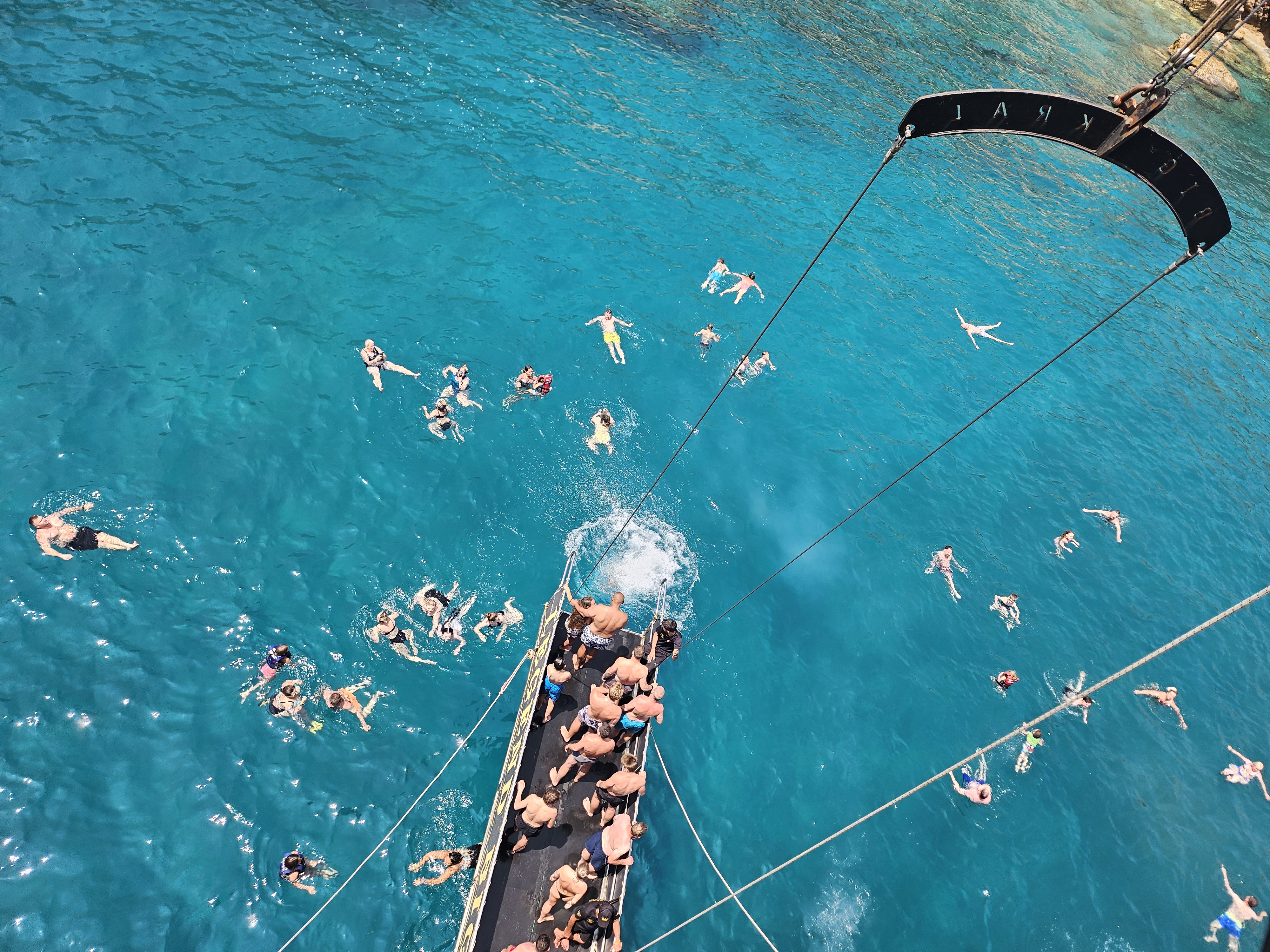 해적선은 열심히 바다를 가르고 앞으로 나아가다 잠시 엔진을 끄고 해변 가까운 곳에 정박을 하였습니다. 그리고 방송으로 배 뒤편으로 내려가 바다 수영을 할 수 있다는 멘트를 배 안에 울려 퍼뜨려 주었습니다. 배에 탄 사람들은 하나둘 바다를 향해 뛰어들어갔고, 즐겁게 지중해 바다에서 수영을 하며 즐거운 시간을 보내고 있었습니다.