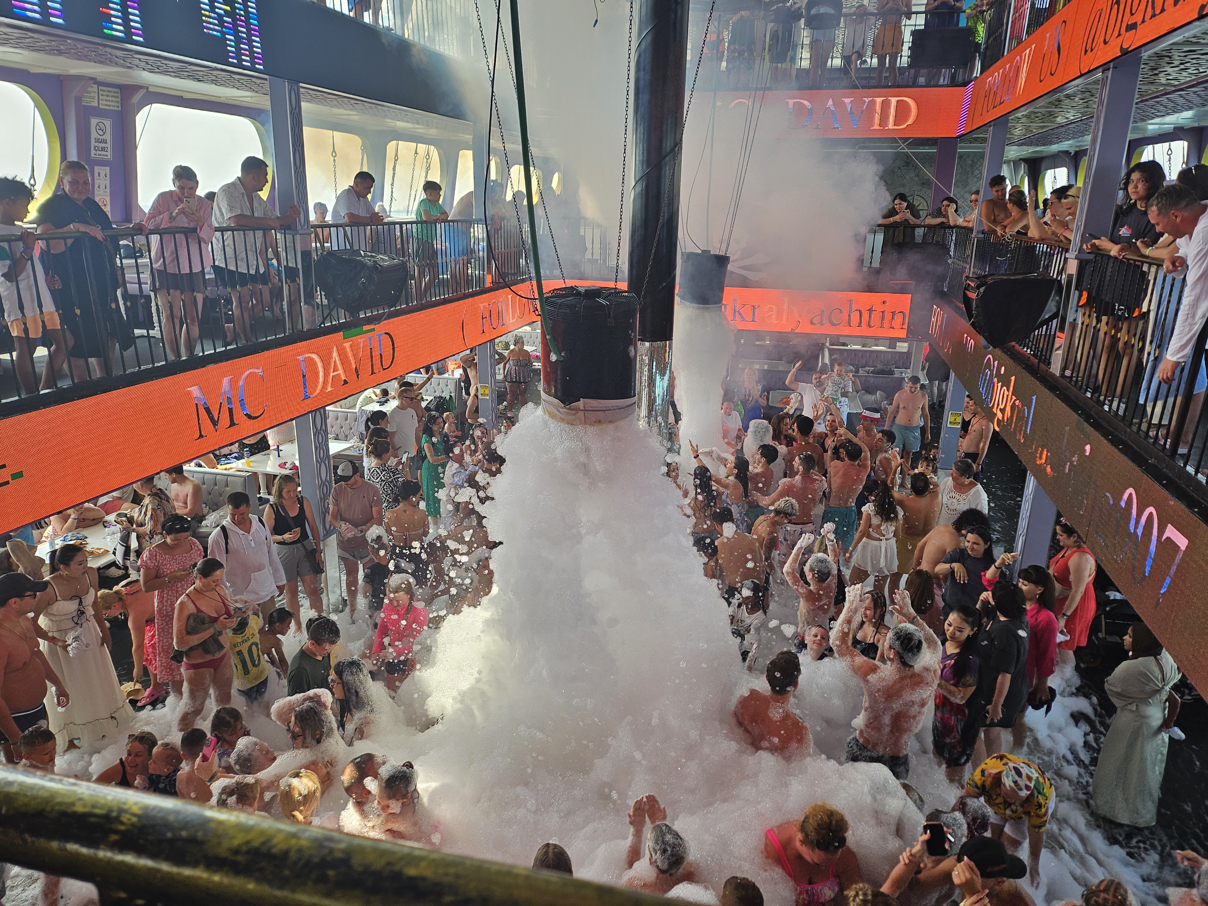 선박의 규모가 5층 규모라 선박의 중심에는 2~4층까지 뚫려 있는 넓은 홀이 존재하였고, 3층에서 DJ가 신나는 음악을 틀어주고, 아래에선 사회자가 사람들과 함께 춤과 게임을 진행하여 축제장을 만들어 갔습니다. 특히 단체 춤을 추는데 낯익은 음악 리듬을 느낄 수 있었는데 바로 싸이의 '강남스타일'을 틀어주고 모두들 말춤을 추며 이 순간을 즐기고 있었습니다. 노래가 끝나갈 쯤엔 천장에 달려있는 팬과 호스를 통해 대량의 버블을 홀로 뿌려주며 축제의 클라이맥스를 장식하고 있었습니다. 홀에 모인 아이들과 젊은 친구들은 음악과 버블을 신나게 즐기는 모습을 보며 한편으로는 젊음이 부럽게 느껴지기도 했습니다.