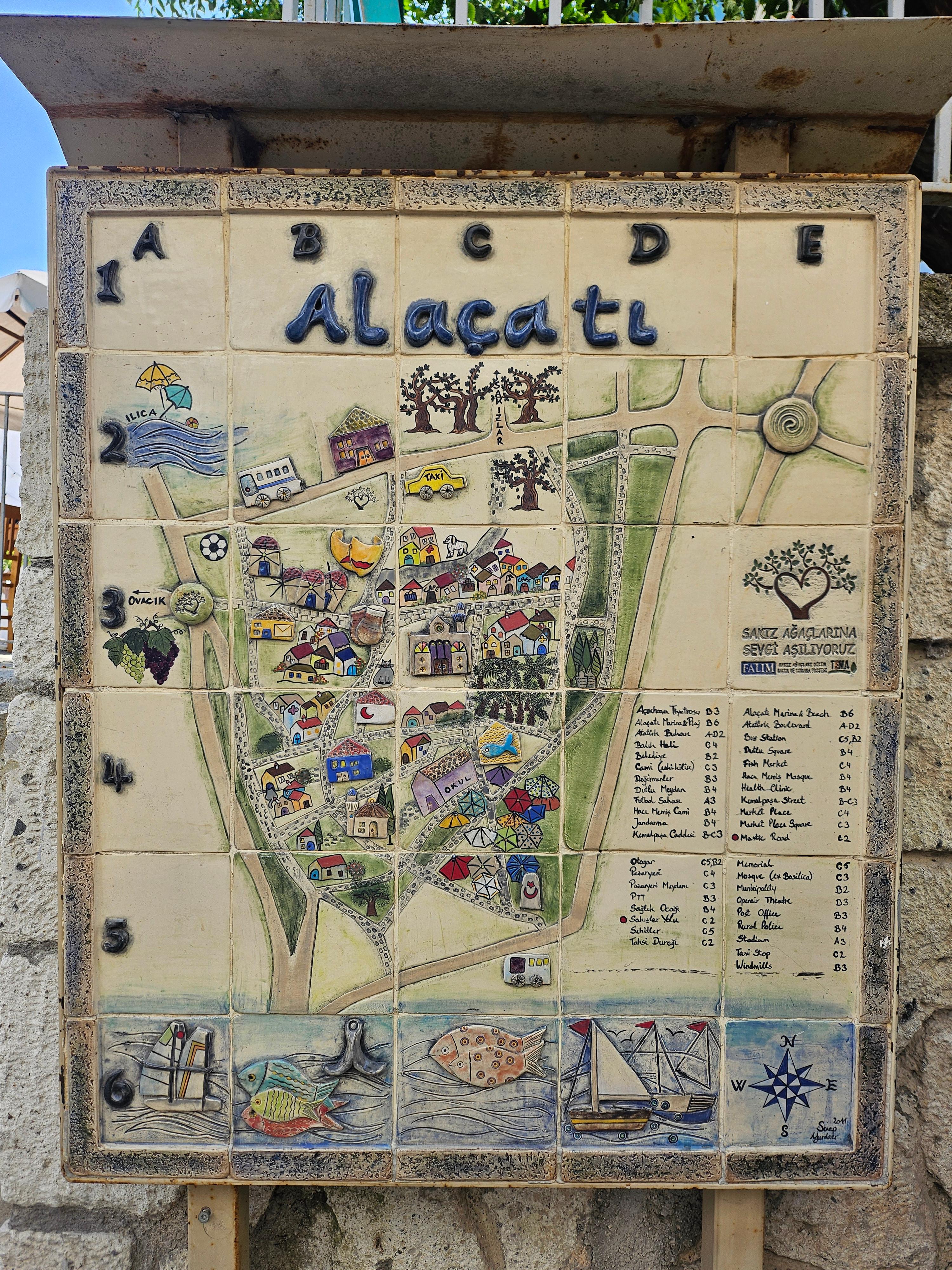 마을 어느 지점을 걸어 다닐 때 마주친 마을 지도였습니다. 관광지역인 만큼 아기자기하게 꾸며놓은 지도를 볼 수 있었고, 마을 곳곳을 이쁘게 표현해 두어서 한컷 남겨봅니다. 마을 중심지를 기준으로 약간 외곽 부분에는 호텔과 숙박 시설이 많이 있었고, 사진과 같이 이곳 'I 💖 Alacati'의 조형물도 보입니다.